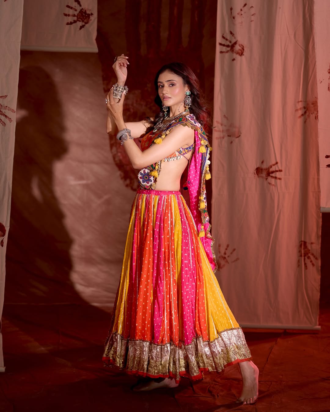 This Set features a bandhani skirt with kiran lace and toi all over with 6"-inch lumpi, creating a 7-meter flare paired witha muga blouse featuring patchwork on the sleeves and Kodi Trims and a 3/4 patch bandhani dupatta with handwork and trims.