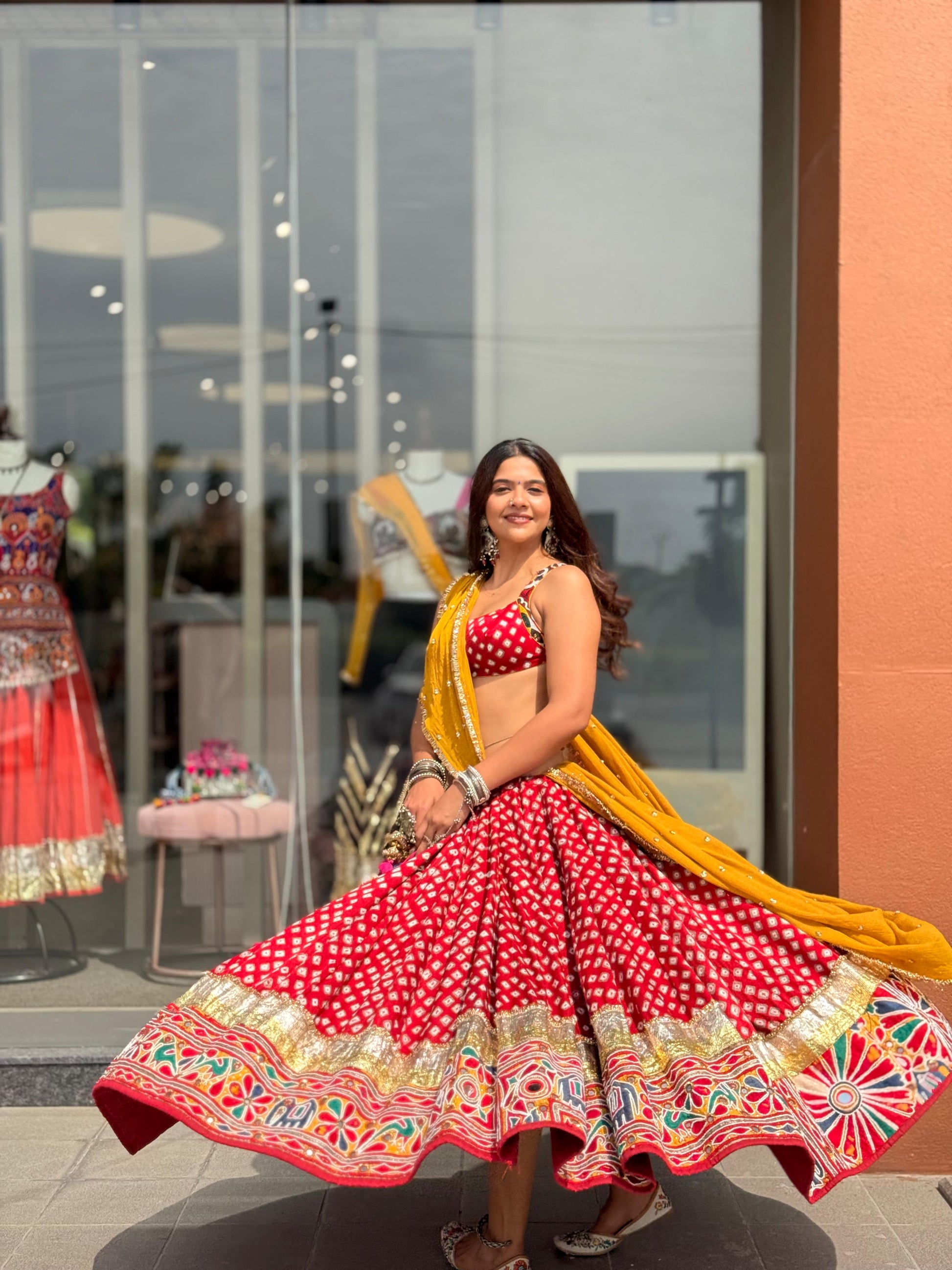 This is a bandhani skirt has kiran lace with 3"-inch lumpi and patch creating a 7-meter flare.