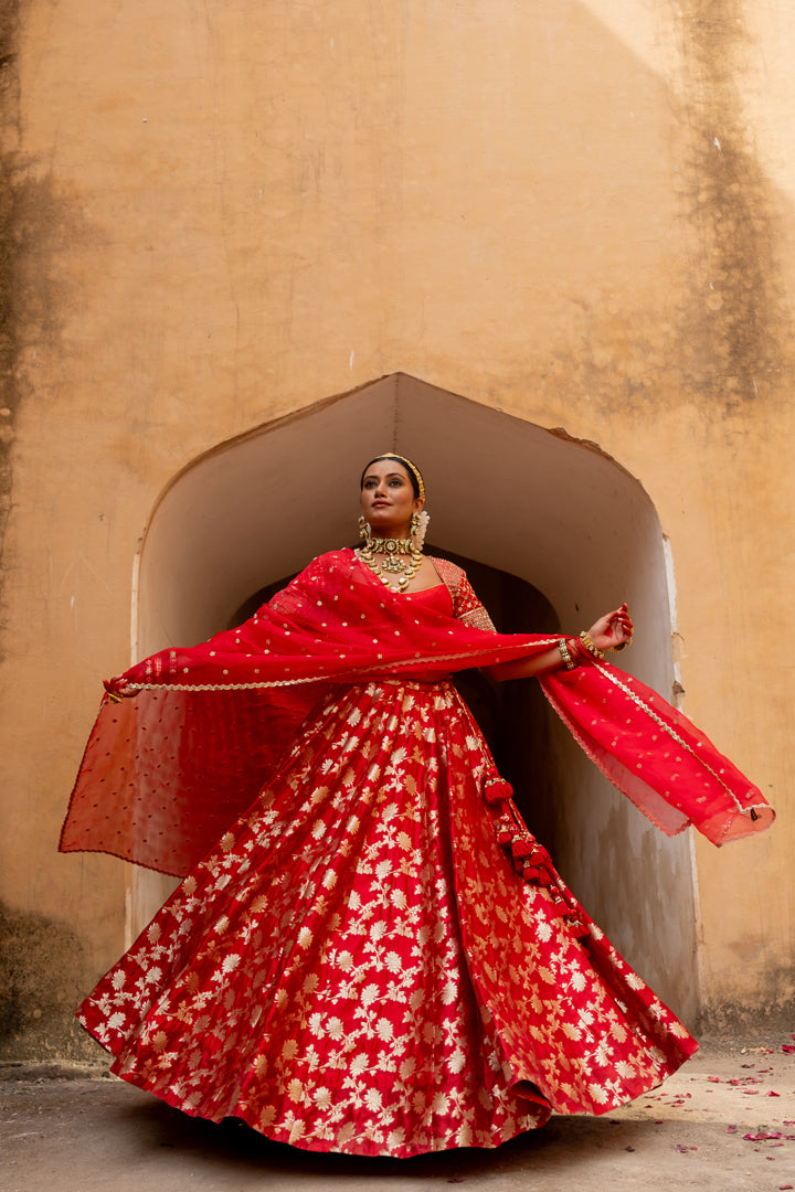 A red banarasi silk lehenga paired with blouse and sheer dupatta have hand embroidered work.