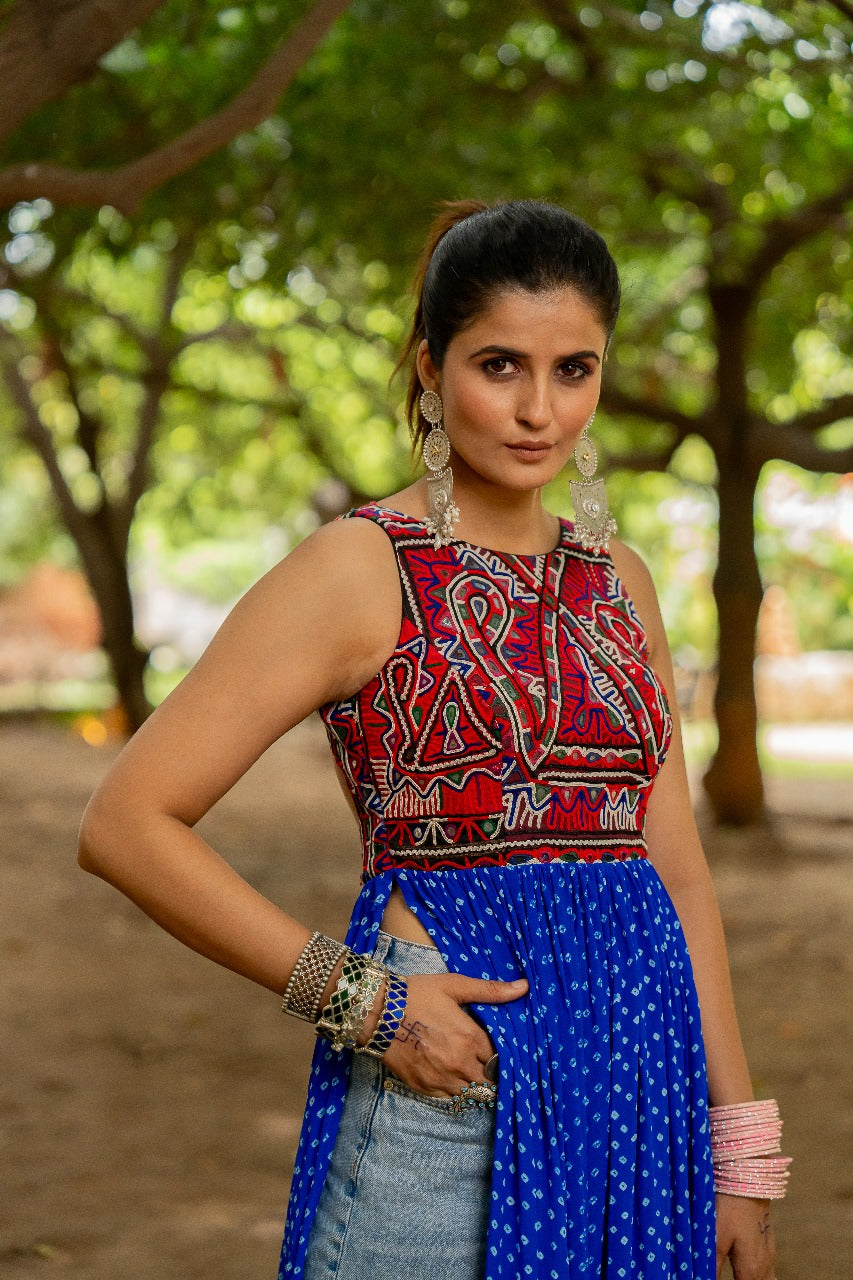 A Bandhani kurta with coin trims at the hem, featuring a boho patch on the bodice for a chic fusion touch.