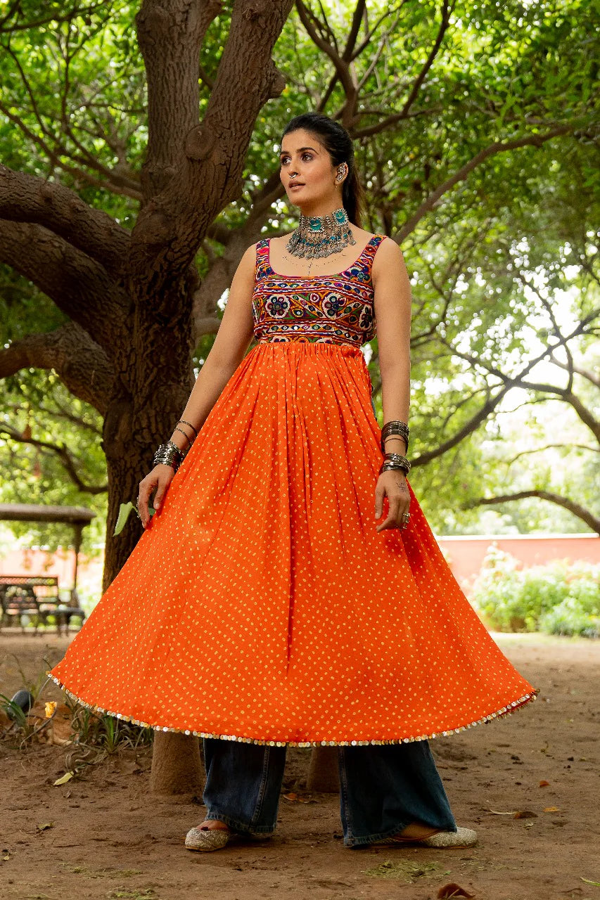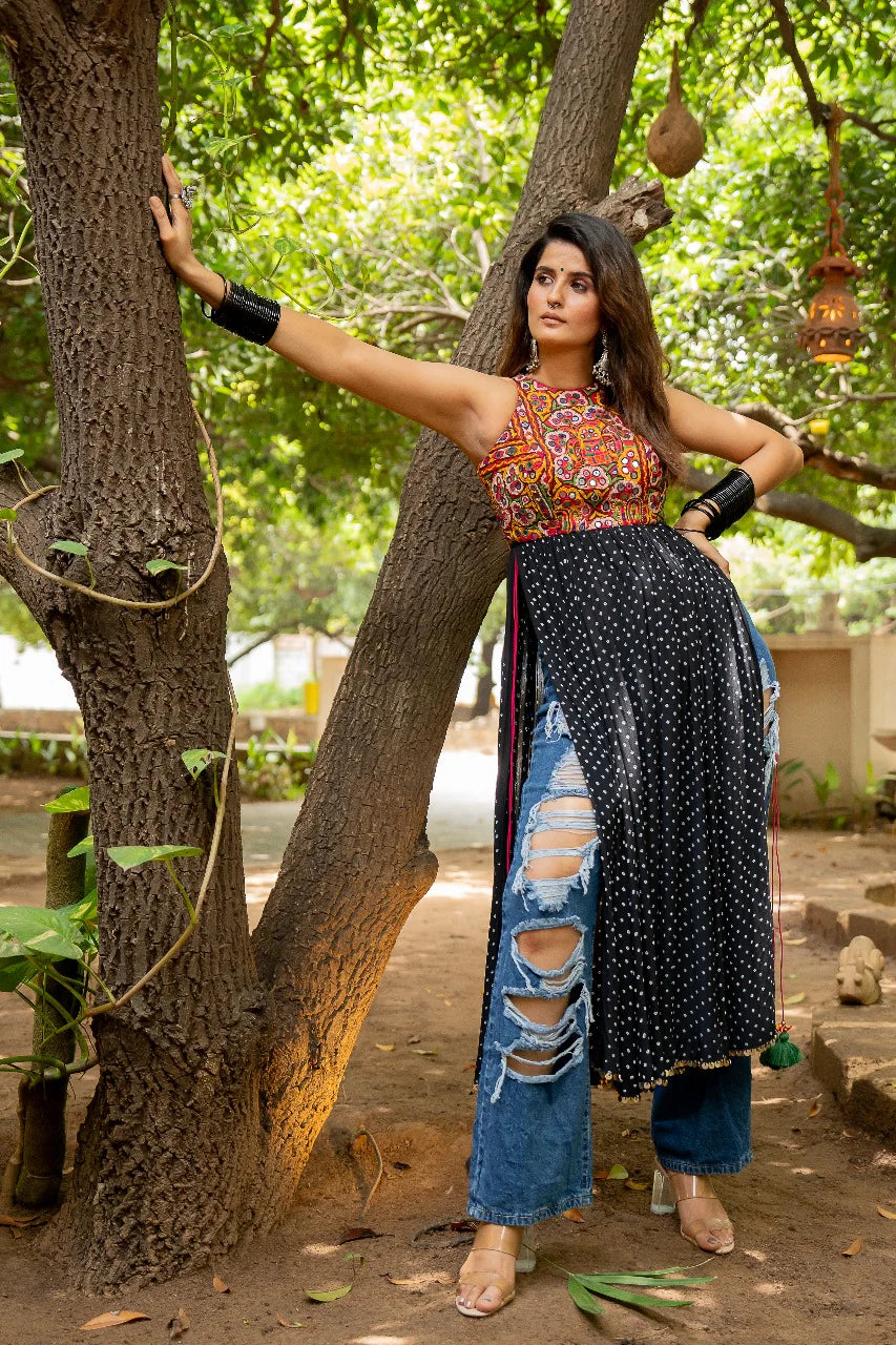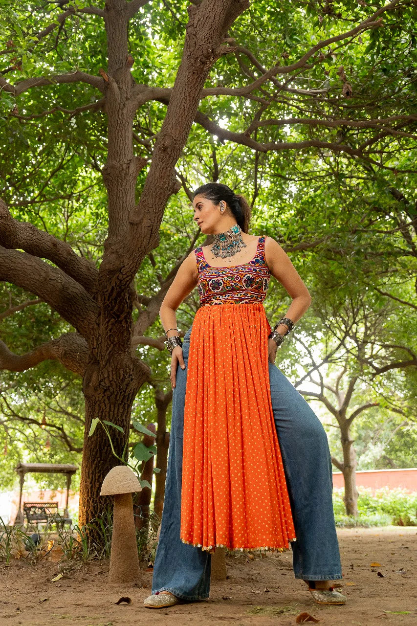 A Bandhani kurta with coin trims at the hem, featuring a boho patch on the bodice for a chic fusion touch.