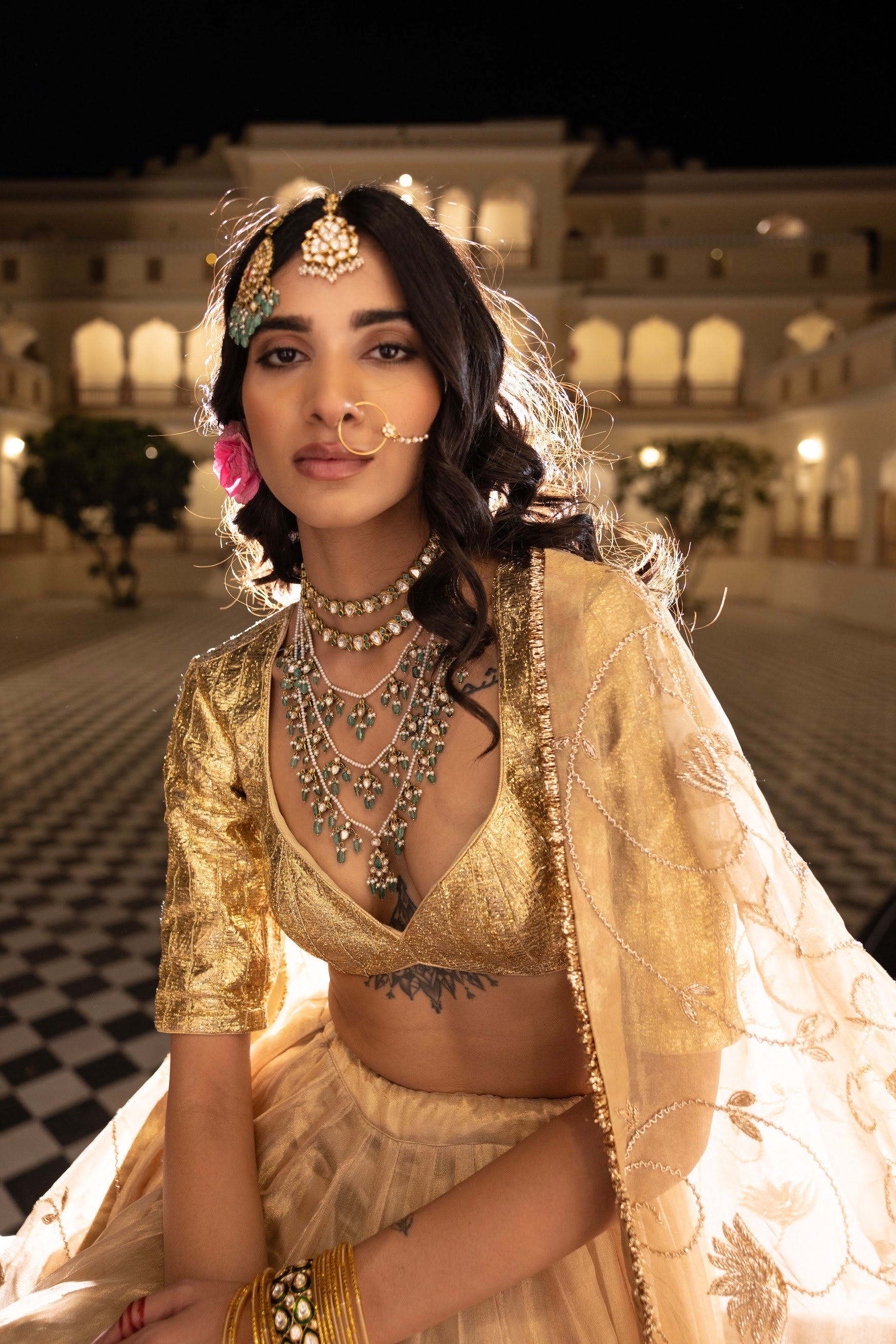 A golden lehenga in tissue base with gold lumpi creating 10 meters flare, paired with a lumpi blouse and an embroidered organza dupatta.