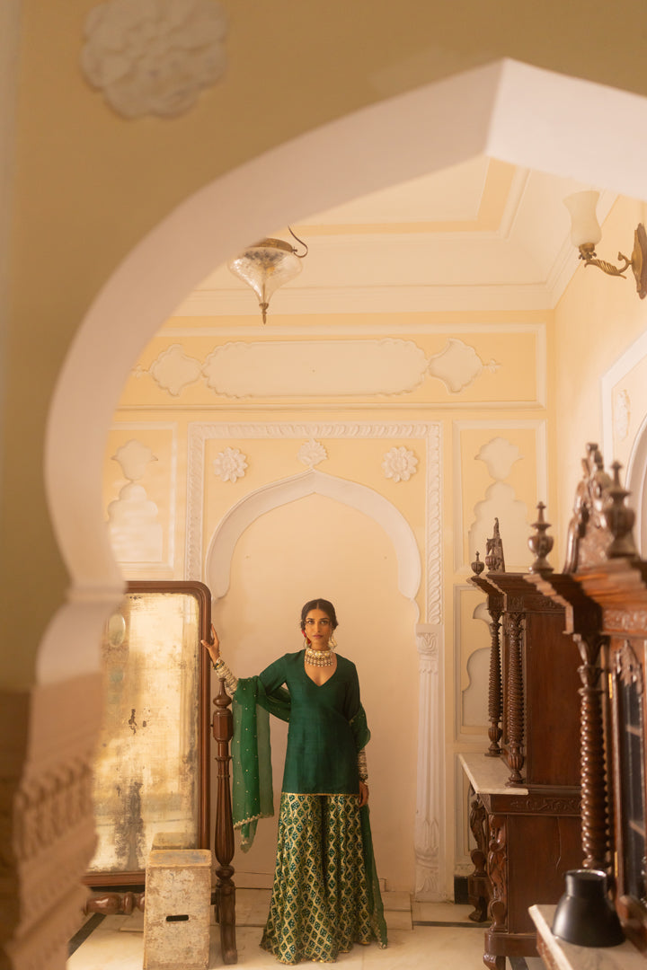 A Banarasi Bandhani Sharara paired with hand embroidered kurta and dupatta.