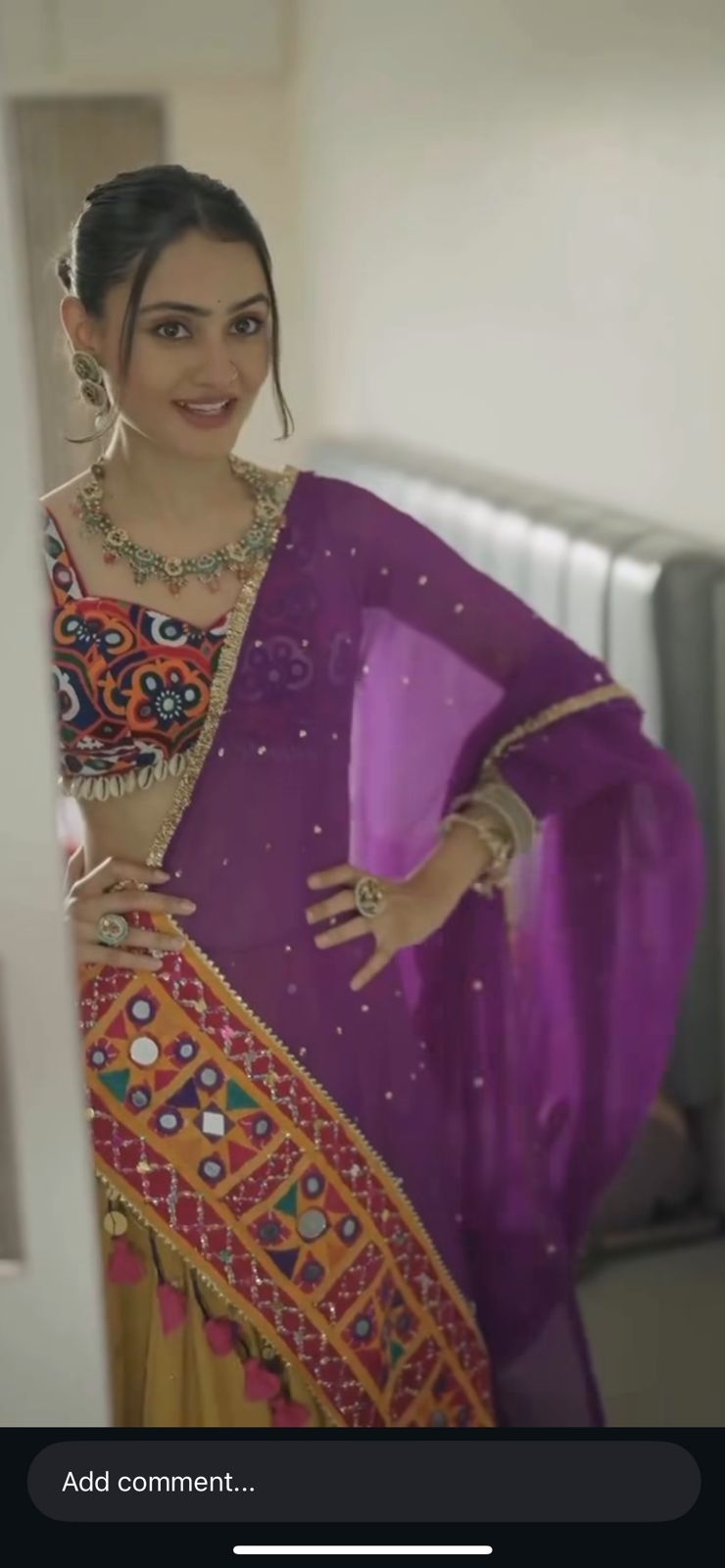 It is a cotton gamthi skirt with 3-inch lumpi, kiran lace and heavy patchwork all the hem of skirt with approximately 7 meters of flare with a patch blouse featuring Kodi Trims and a 3/4 patch chiffon dupatta with handwork and trims.
