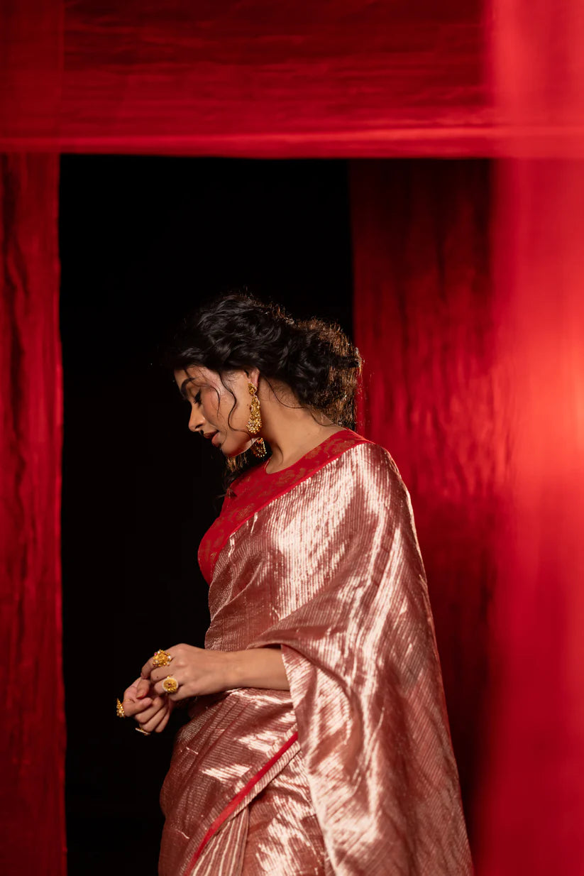 A Tissue Saree adorned with a coin-trimmed border comes with blouse piece.