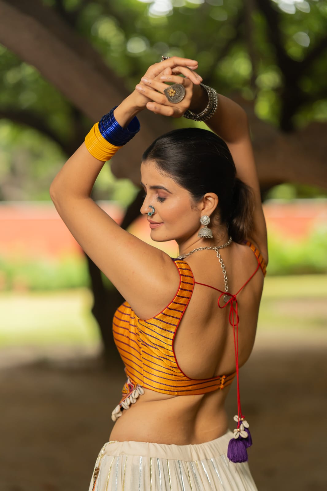 This Set features a gamthi skirt with kiran lace and toi all over with 3"-inch lumpi and patch, creating a 7-meter flare paired with a Gaji silk blouse featuring toi detailing and patch on bottom with kodi on hem and a chiffon dupatta with tiki work and Kiran lace.