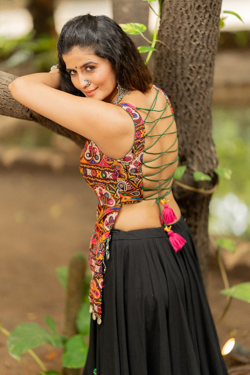 This set features a lumpi gradation gamthi skirt and a long sleeveless Kutchi patch blouse with kodi and coin trims at the hem.