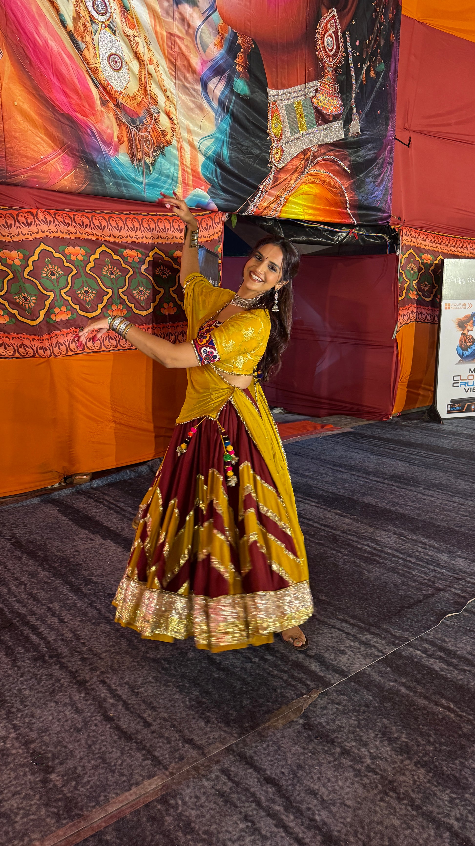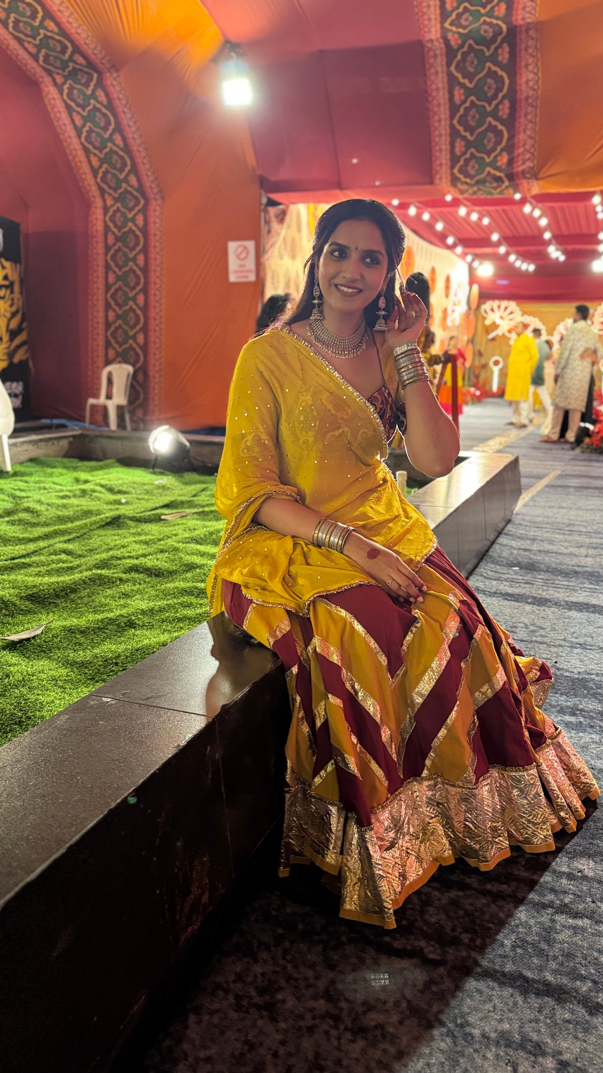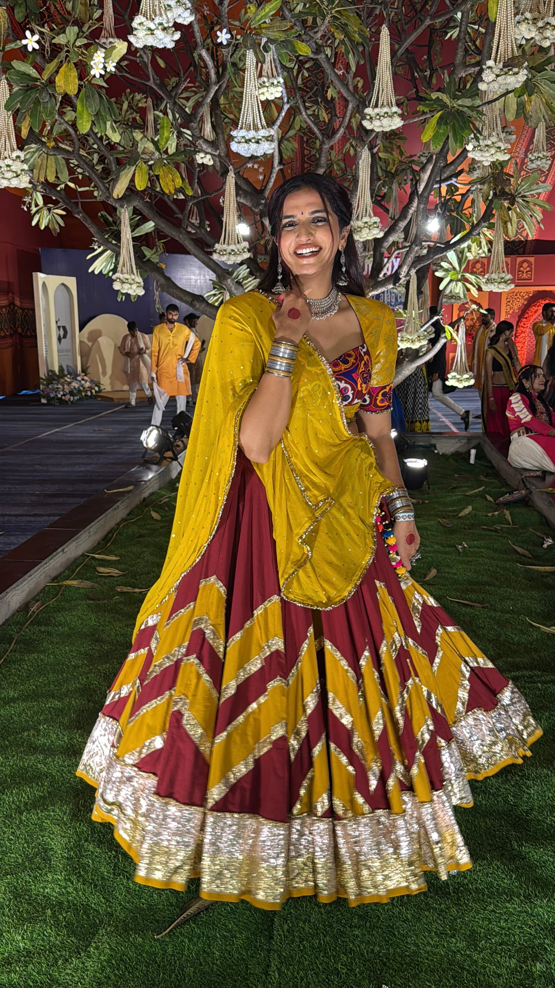 This Set features a Zig Zag gamthi skirt with Lumpi and creating a 10 -meter flare paired with a Muga blouse featuring patchwork detailing and a chiffon dupatta with tiki work and Kiran lace.