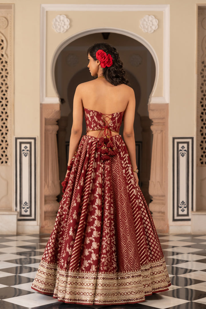 A muga silk multikali lehenga paired with blouse and sheer dupatta have hand embroidered work.
