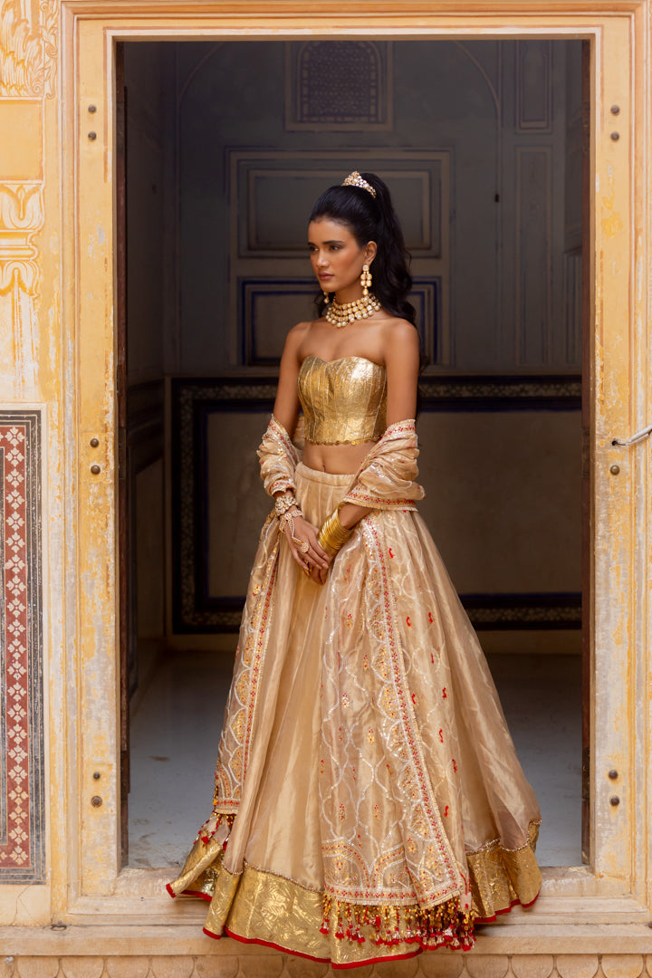 A Tissue skirt with 6-inch Lumpi border paired with Lumpi corset blouse and hand Embroidered Gota patti dupatta.