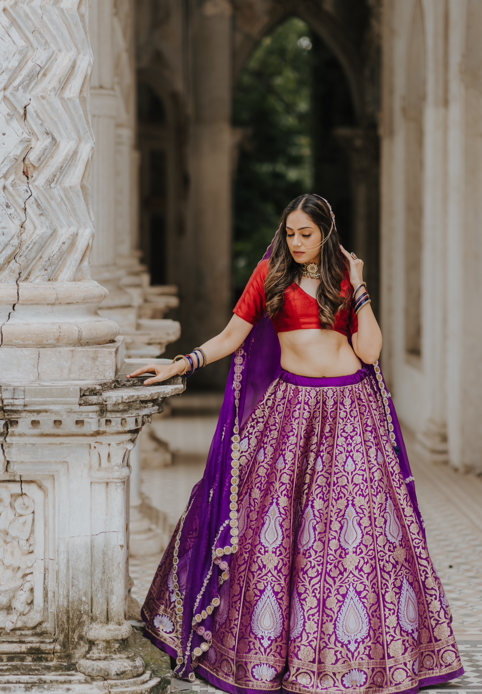 Purple muga banarasi lehenga.