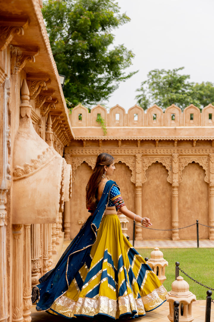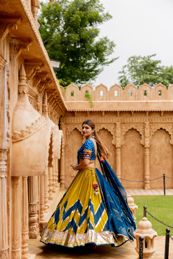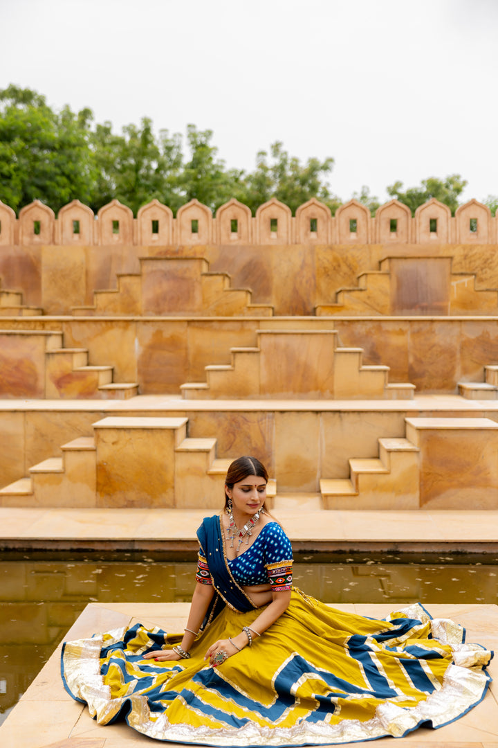 This Set features a Zig Zag gamthi skirt with Lumpi and creating a 10 -meter flare paired with a Gaji silk blouse with kodi bandhani featuring patch on sleeve hem and a chiffon dupatta with tiki work and Kiran lace.