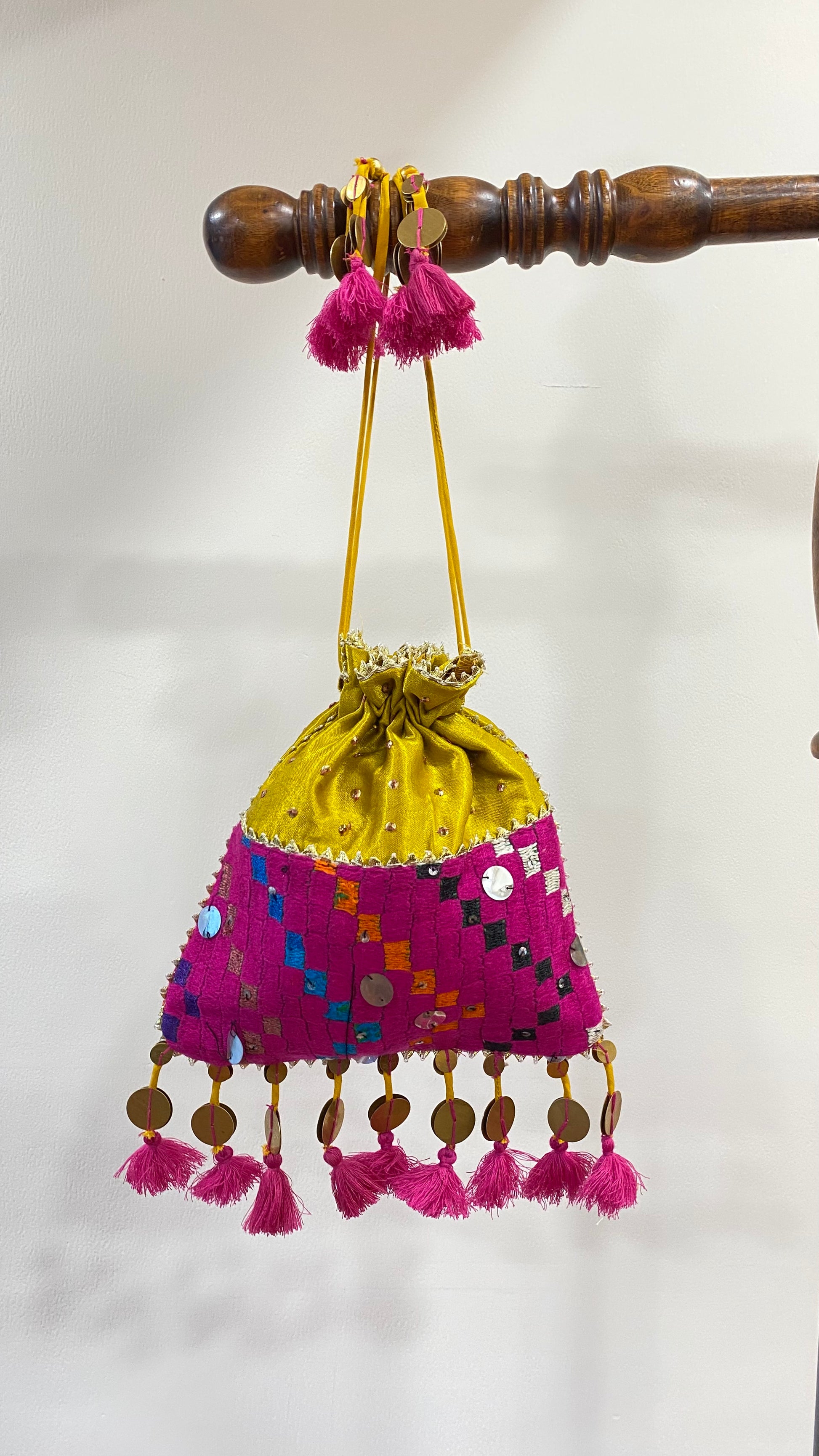 Handcrafted Gajji potli made with patch and coin tassels.