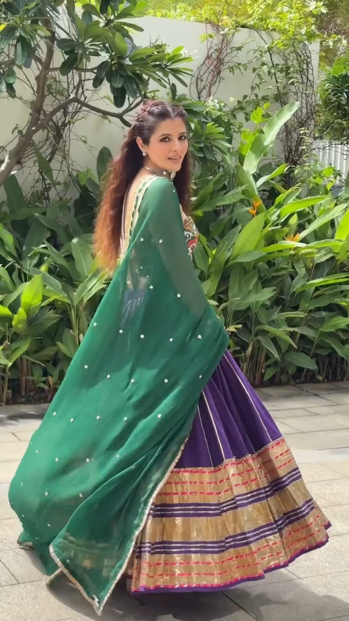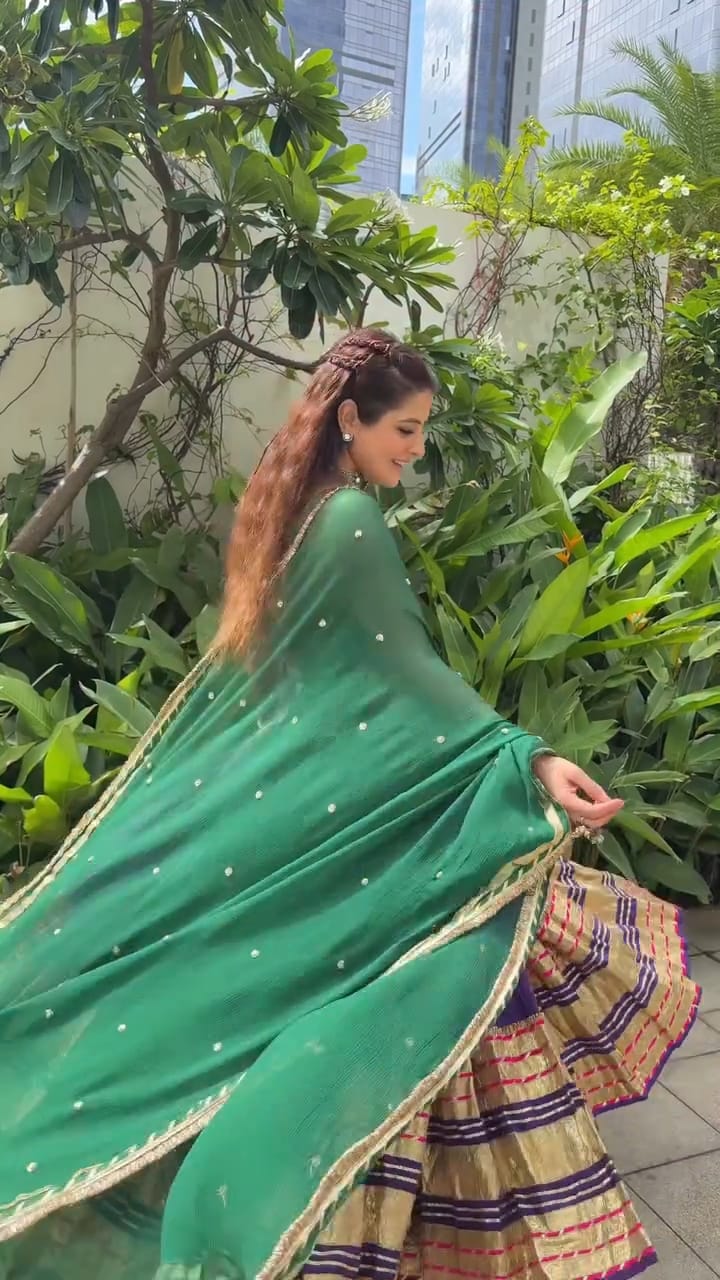 A Leheriya lumpi gamthi skirt with toi creating a 10-meter flare paired with a patchwork corset and a chiffon dupatta with tiki work and Kiran lace.