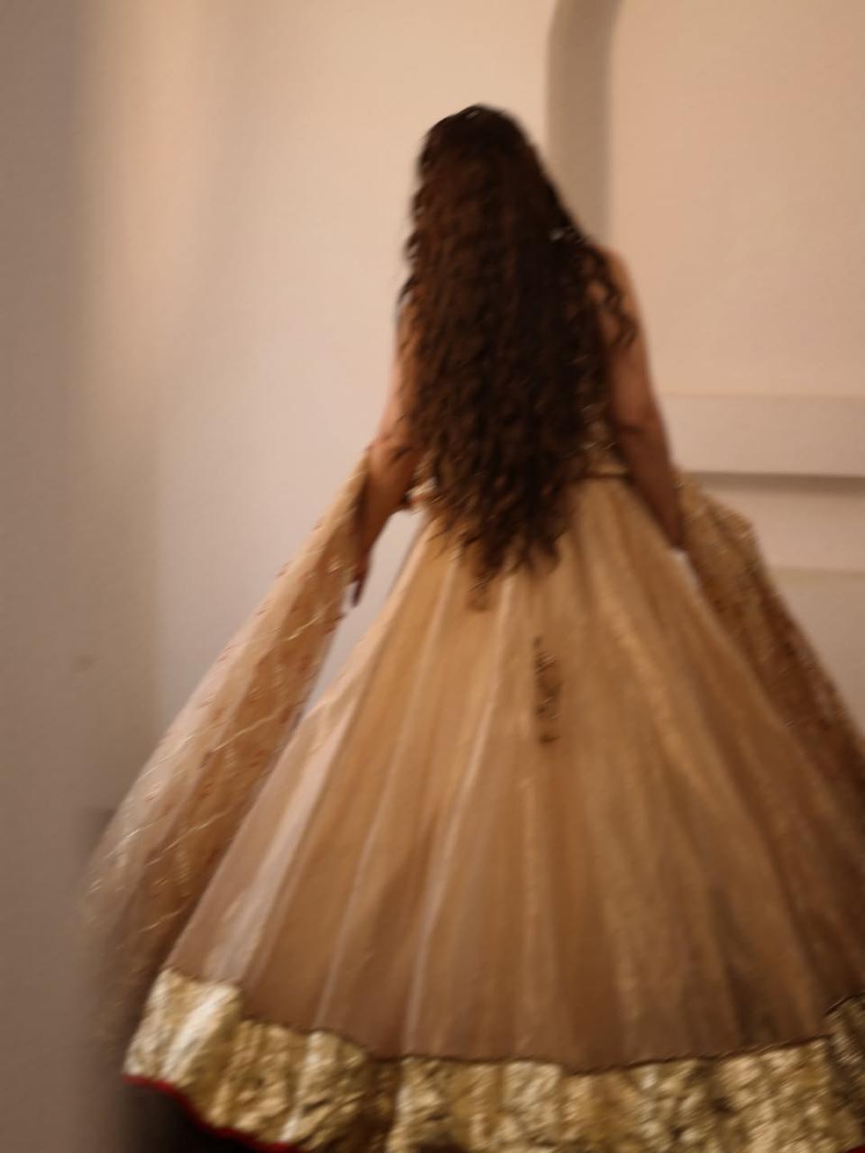 A Tissue skirt with 6-inch Lumpi border paired with Lumpi corset blouse and hand Embroidered Gota patti dupatta.