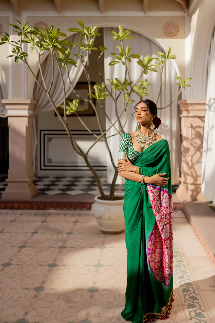 An ombre Banarasi silk saree with gold zari weaving and have tassels and metal coin trims comes with an unstitched blouse piece.
