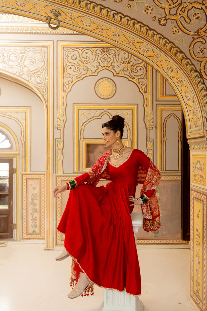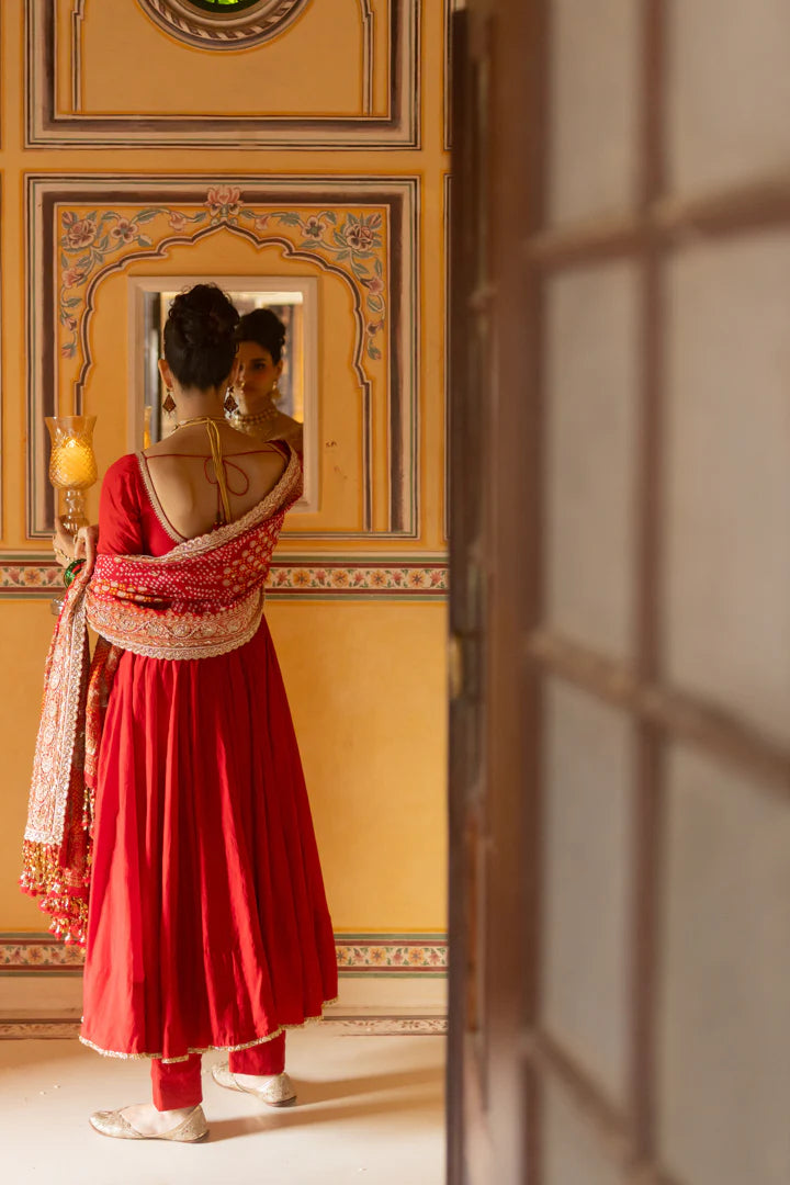 A Spun handworked Anarkali paired with pant and handworked Bandhani Banarasi Dupatta.