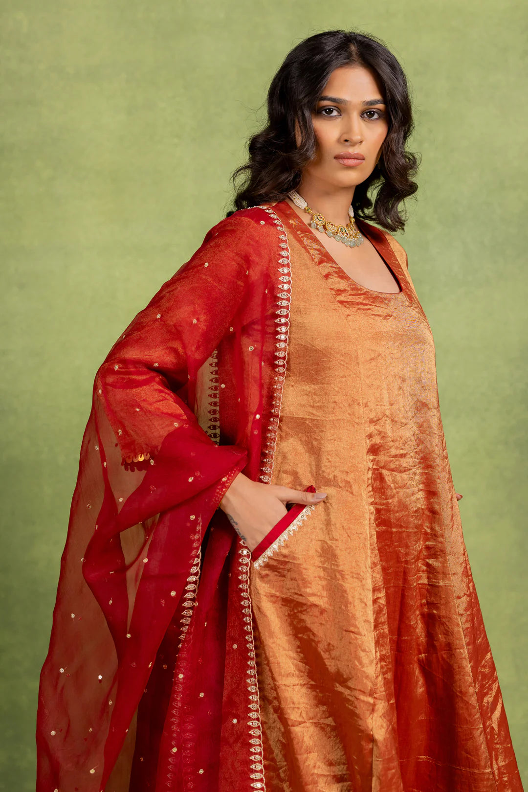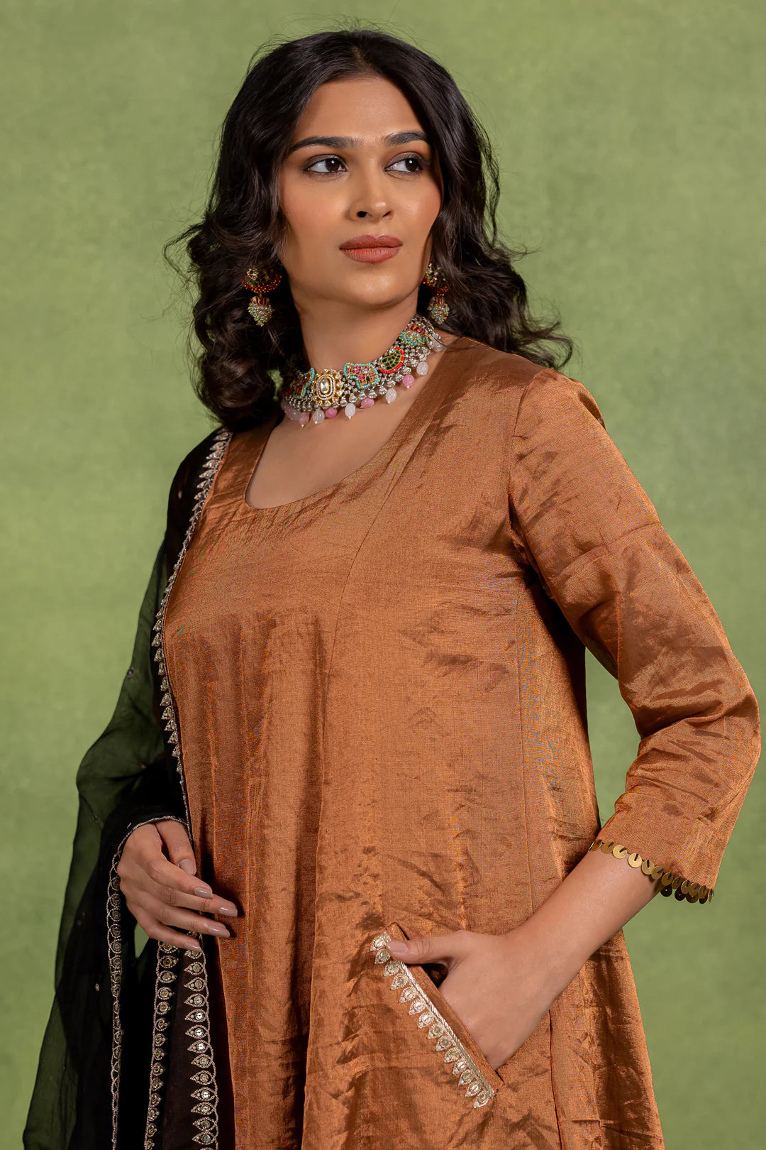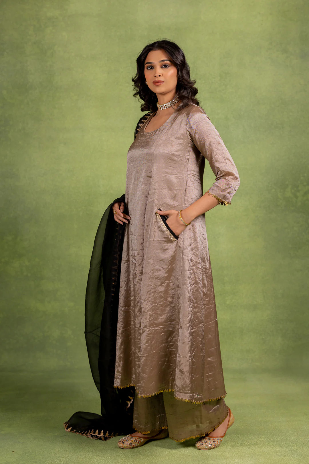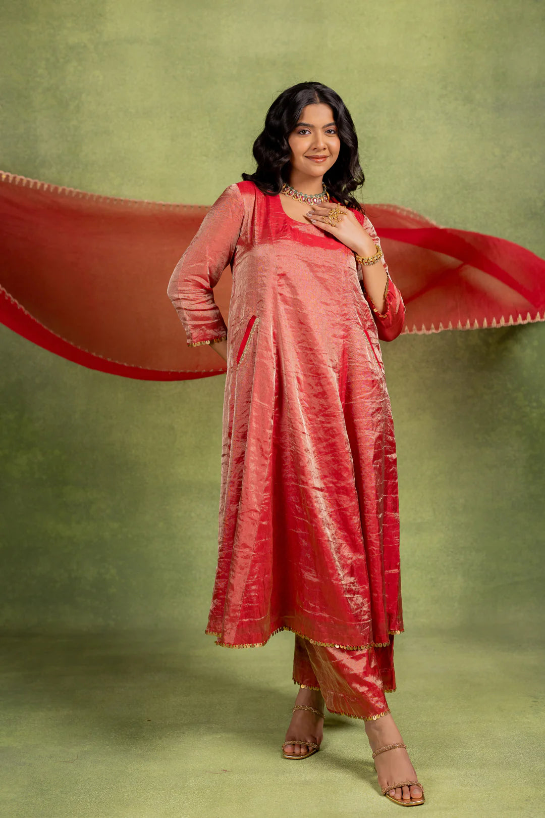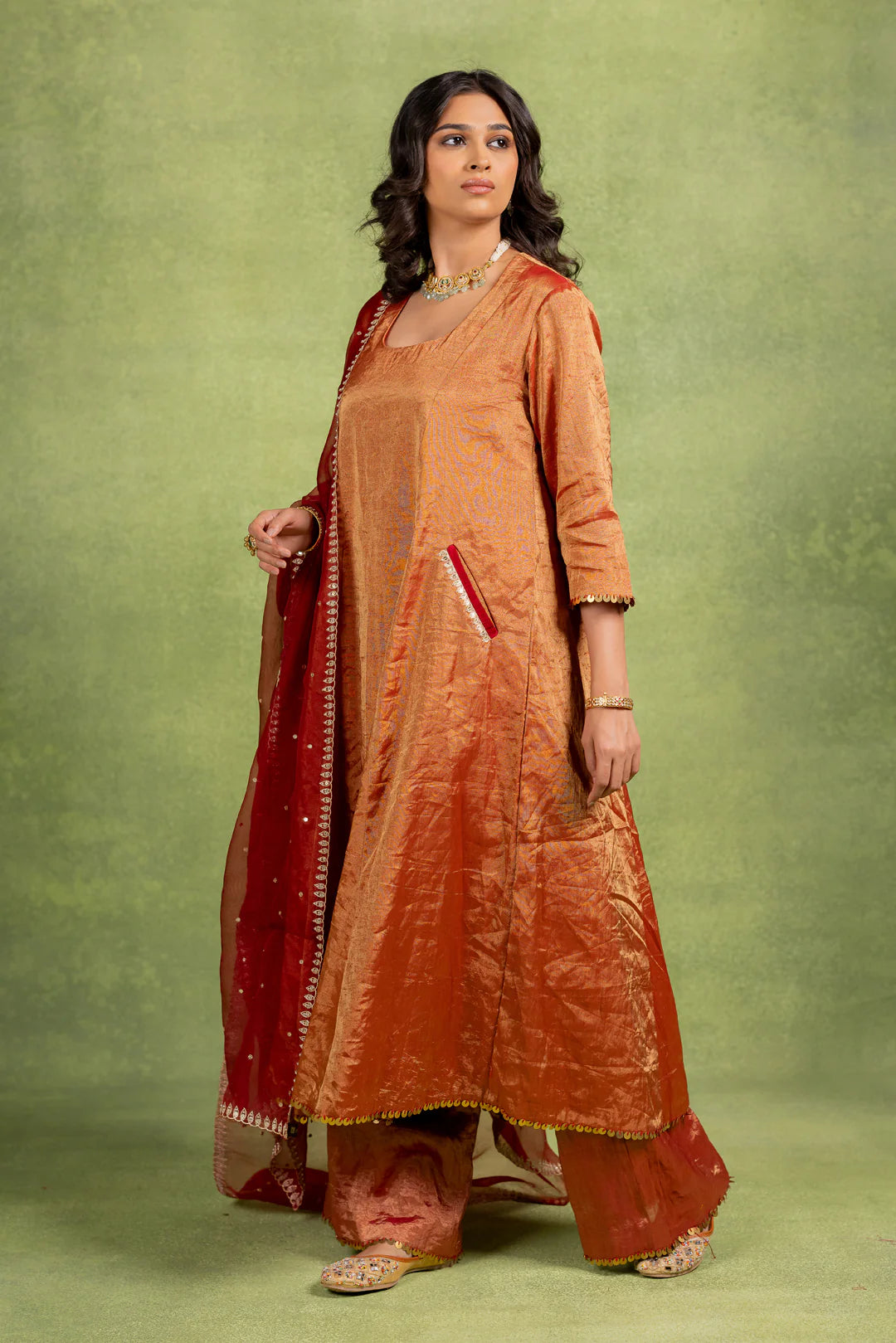 This Coord Set includes an A-line kurta and matching pant with hand-embroidered details on the pocket and dupatta.