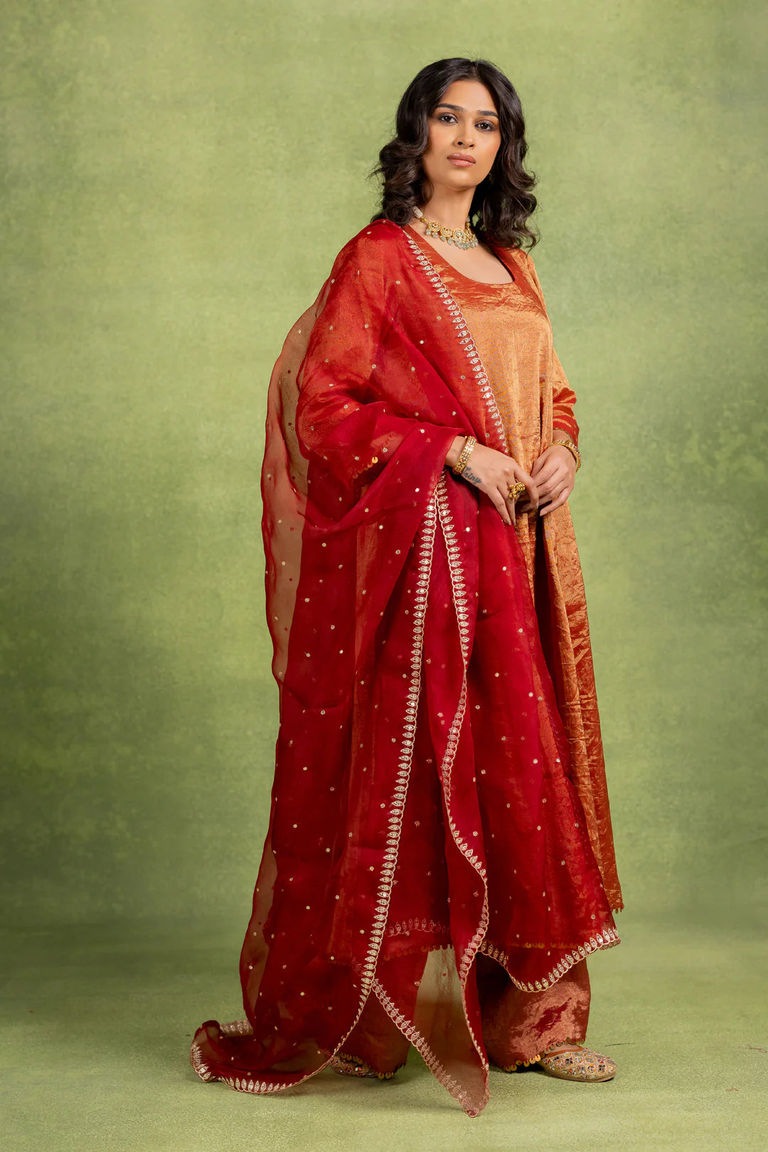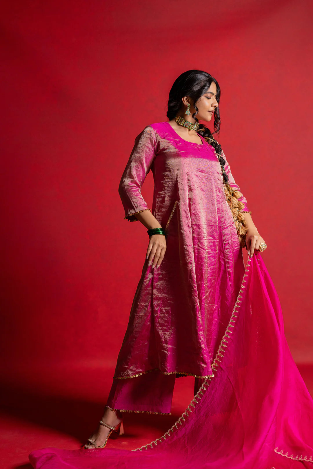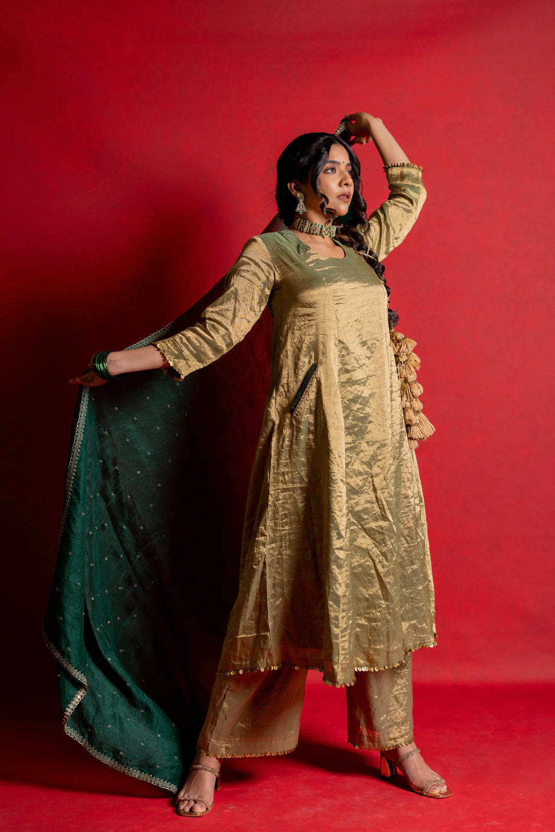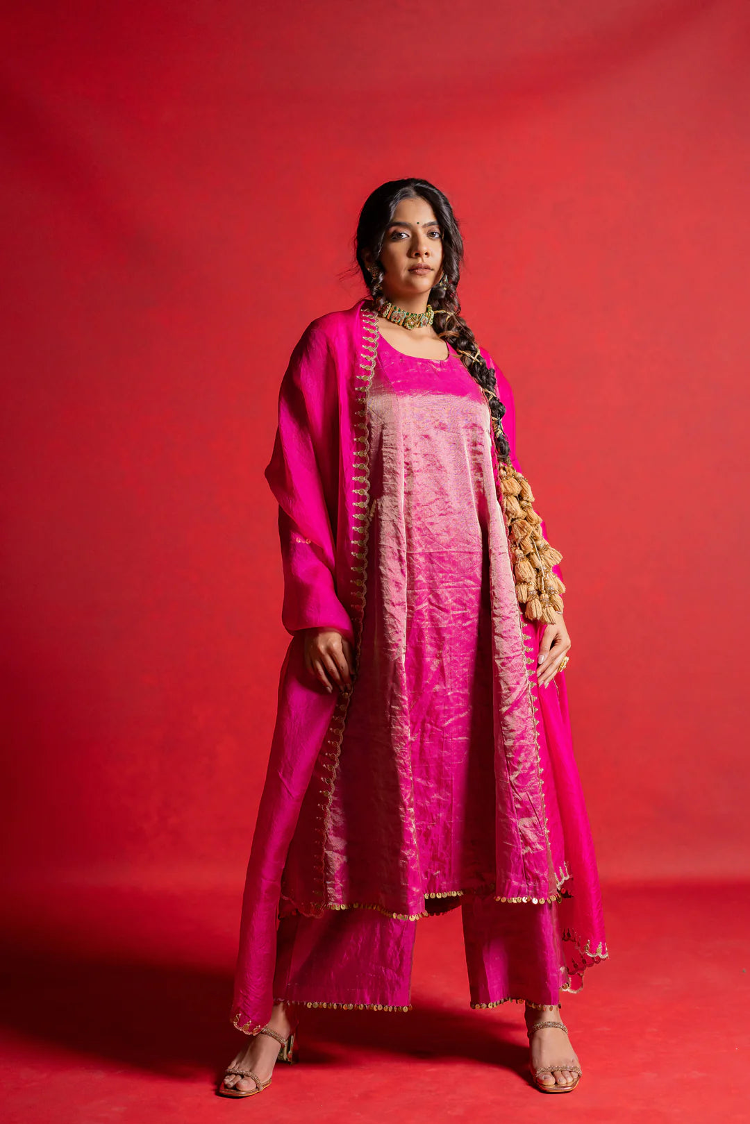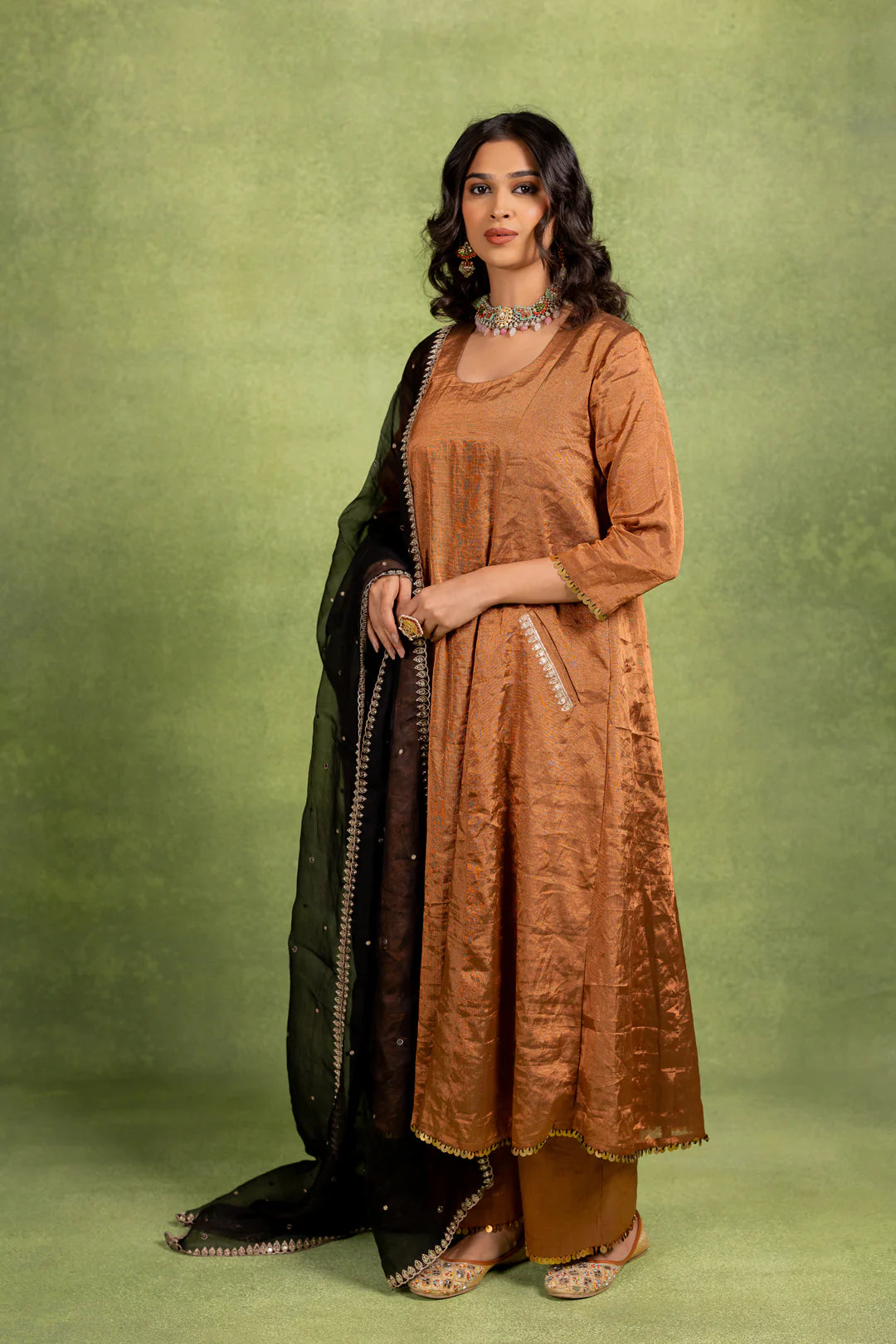 This Coord Set includes an A-line kurta and matching pant with hand-embroidered details on the pocket and dupatta.