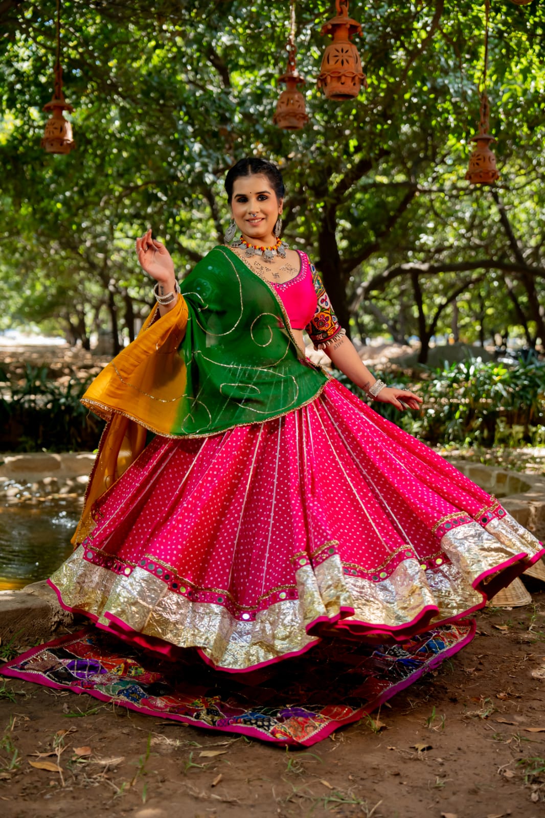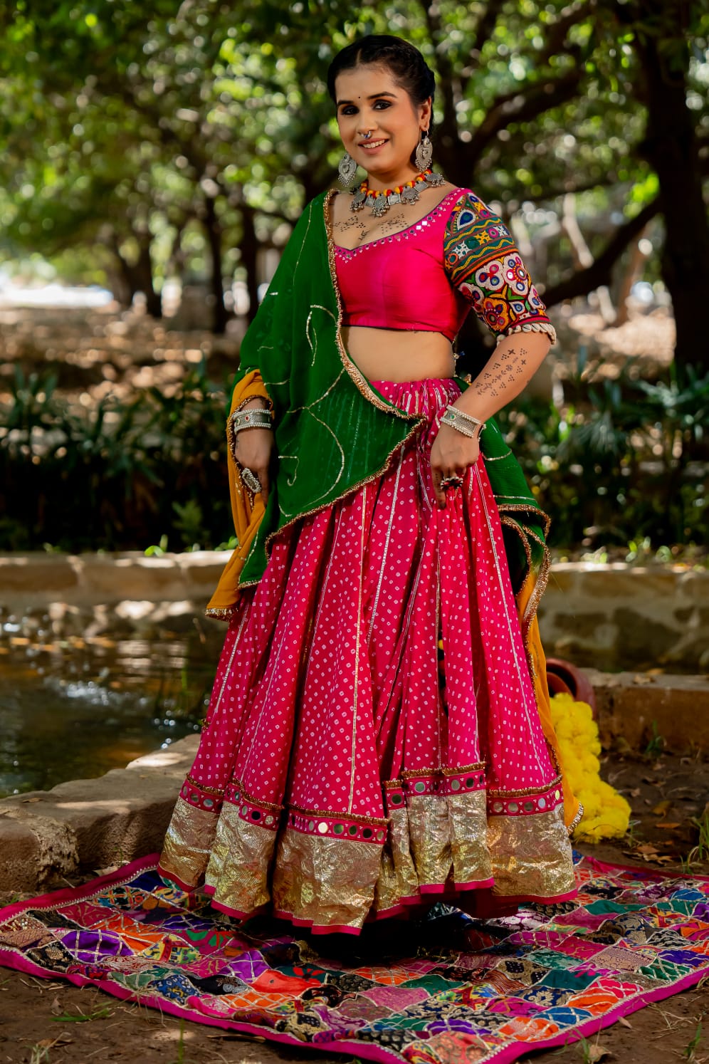This Set features a bandhani skirt with mirror border, kiran lace and toi all over with 6"-inch lumpi, creating a 7-meter flare paired with a Gaji silk blouse featuring mirror work and patch on the sleeves and an ombre chiffon dupatta with tiki work and Kiran lace.