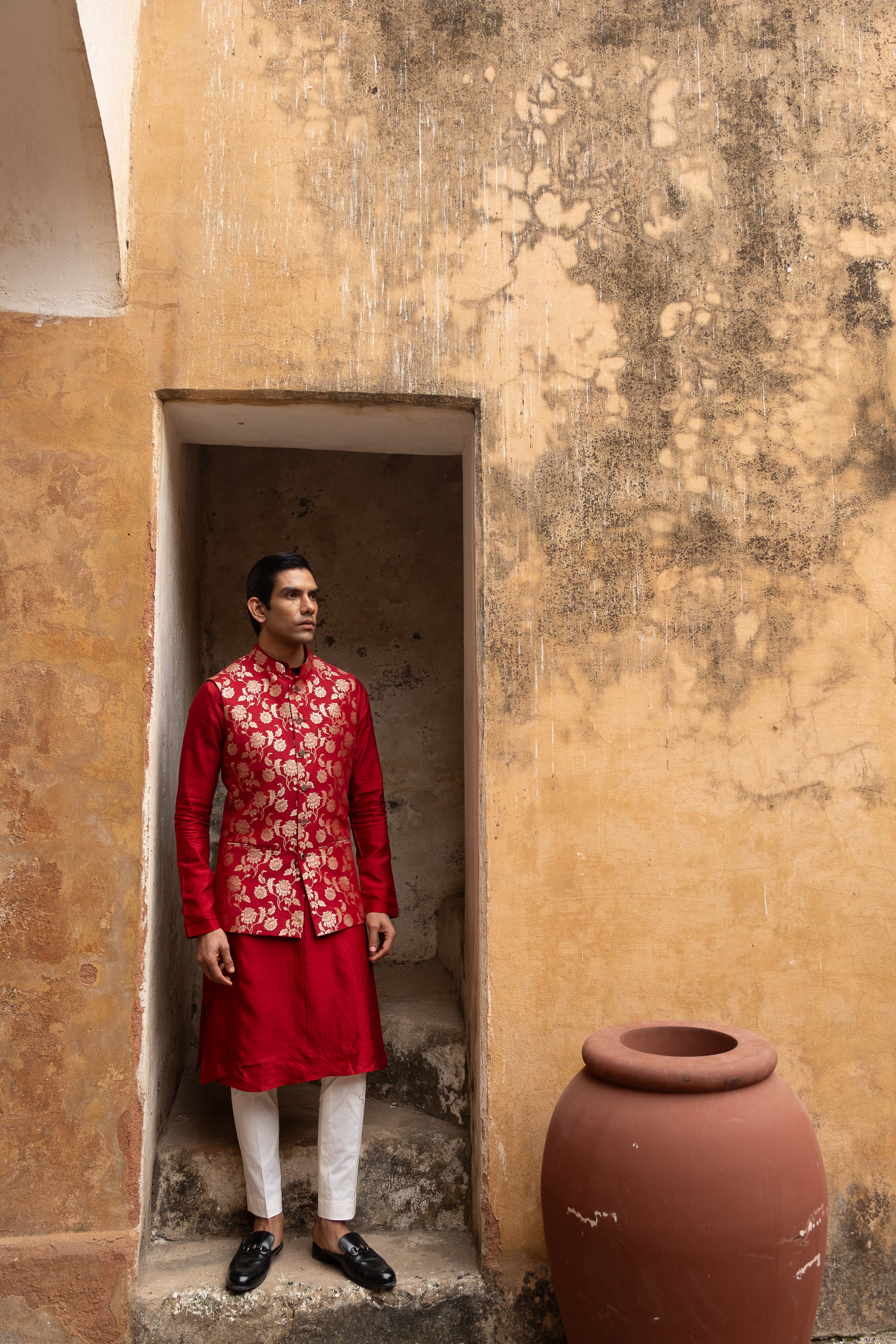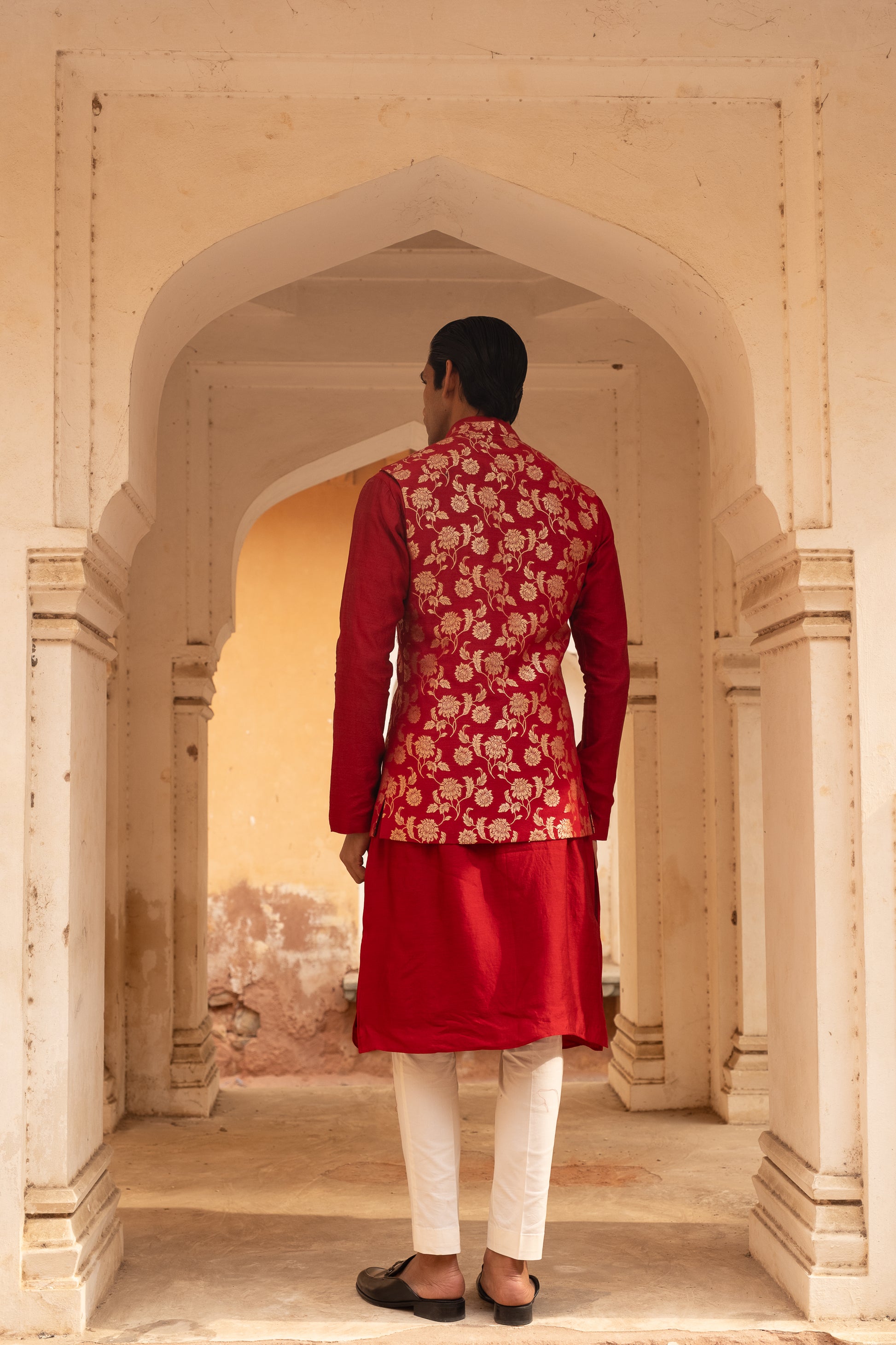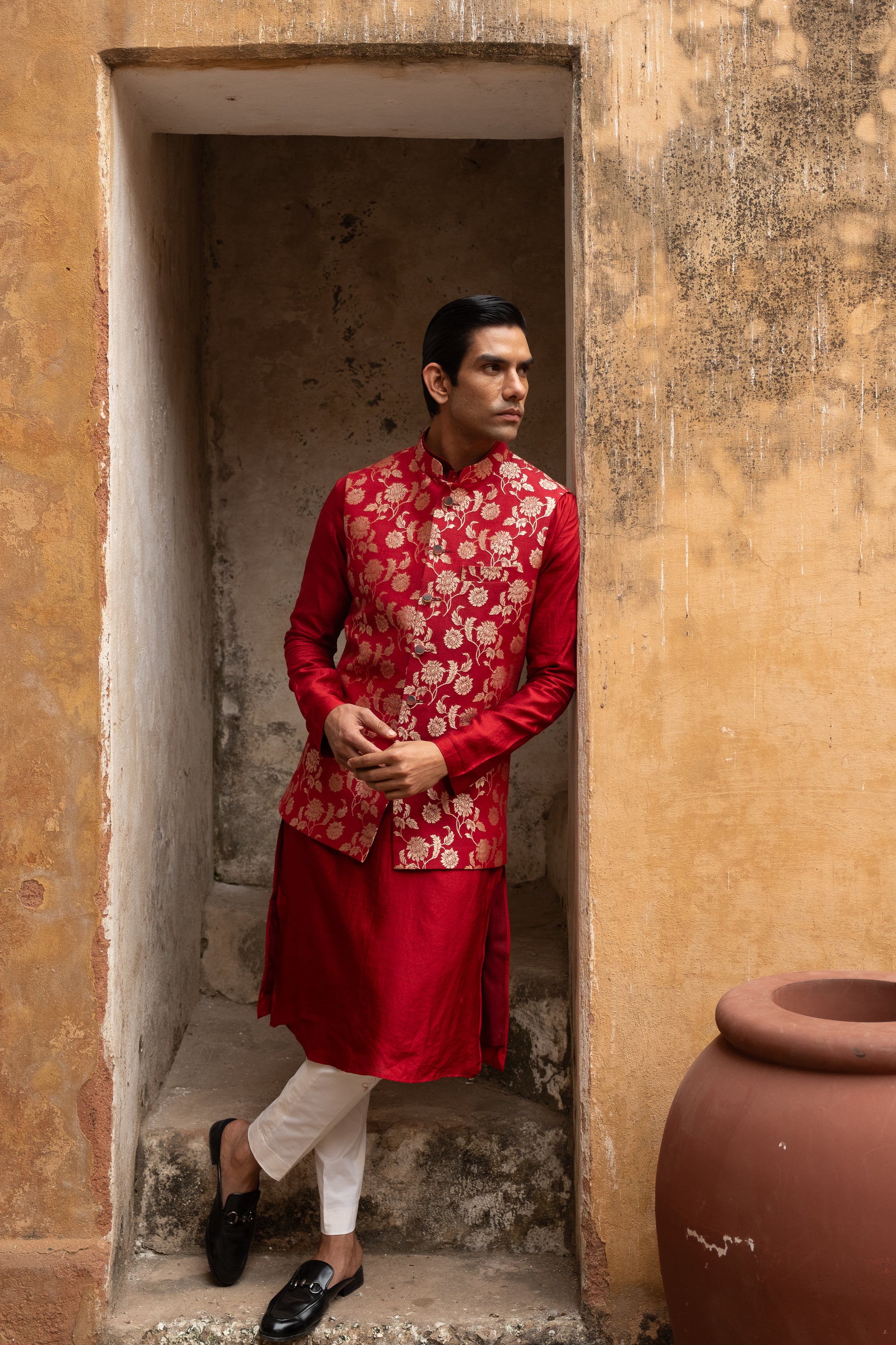 A red raw silk kurta and pant paired with muga banarasi koti.