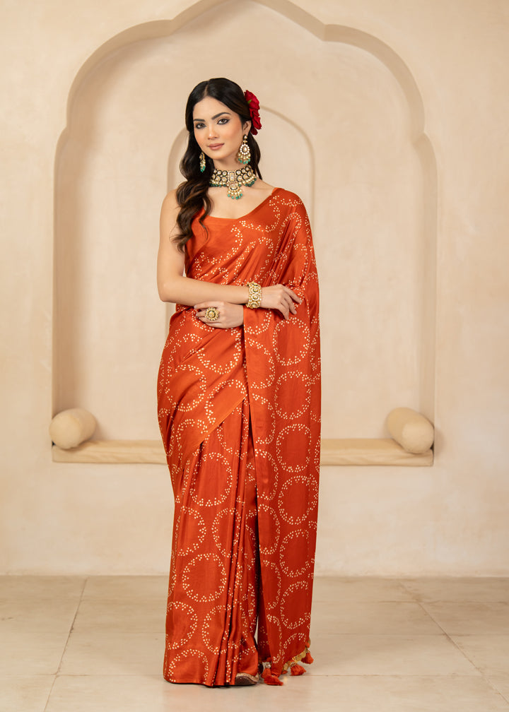 A Bandhani circle motif saree adorned with coin trims and tassels comes with attached blouse piece.