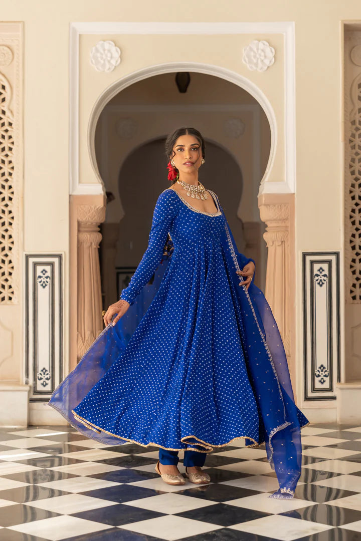 A Bandhani Anarkali paired with pant and hand embroidered dupatta.