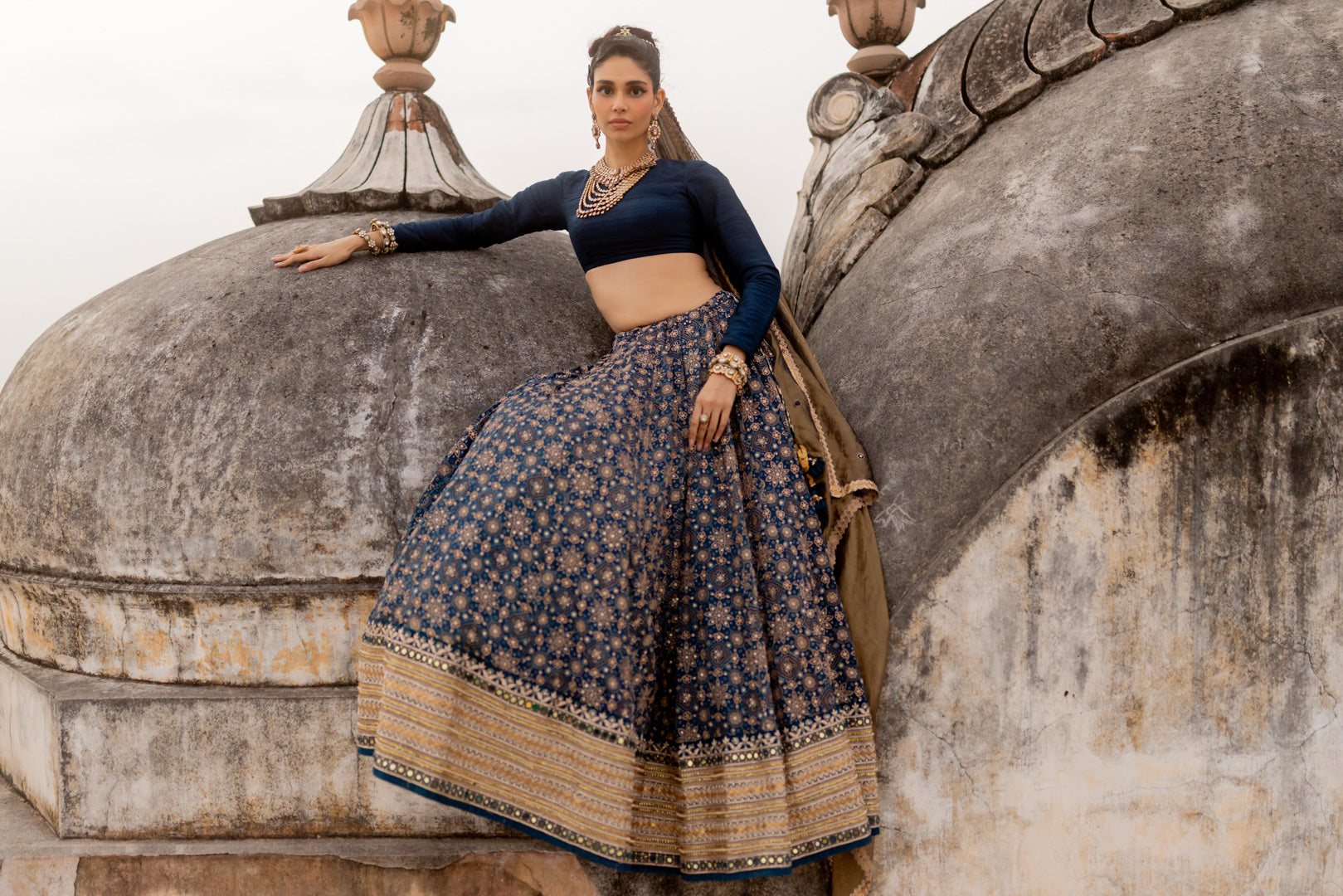 A Teal Ajrakh lehenga with handwork paired with raw silk blouse and embroidered dupatta.