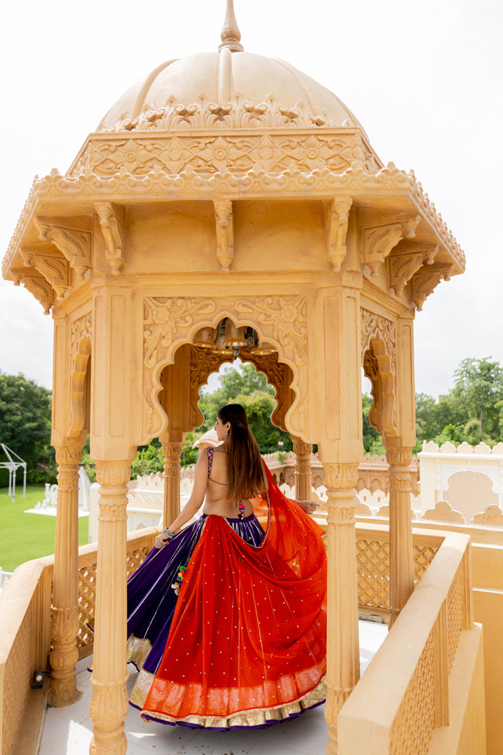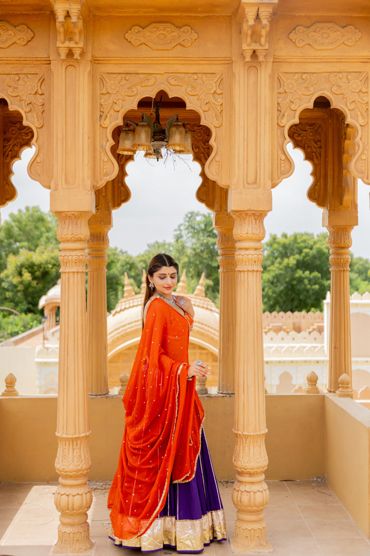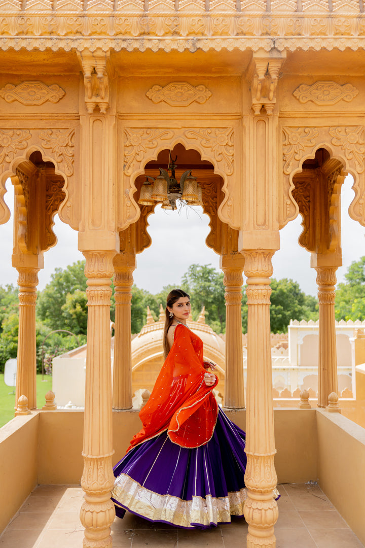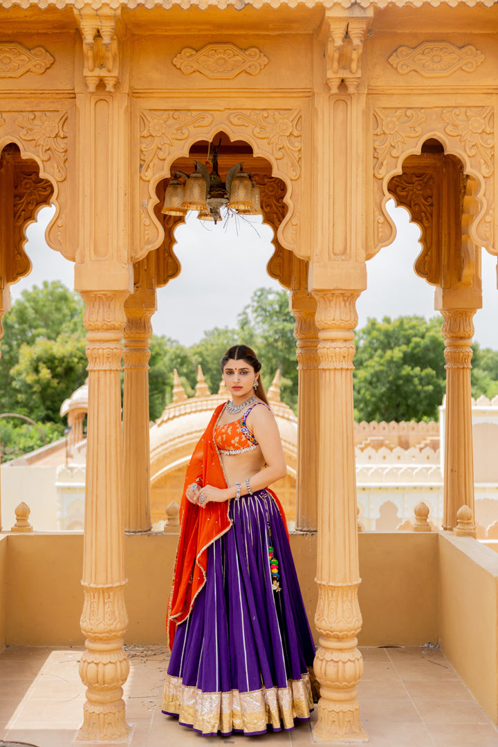 This Set features a gamthi skirt with toi, 6-inch Lumpi and Kiran lace hem, creating a 15-meter flare paired with a muga blouse featuring patchwork on the sleeves and Kodi Trims and chiffon dupatta with tiki work and Kiran lace.