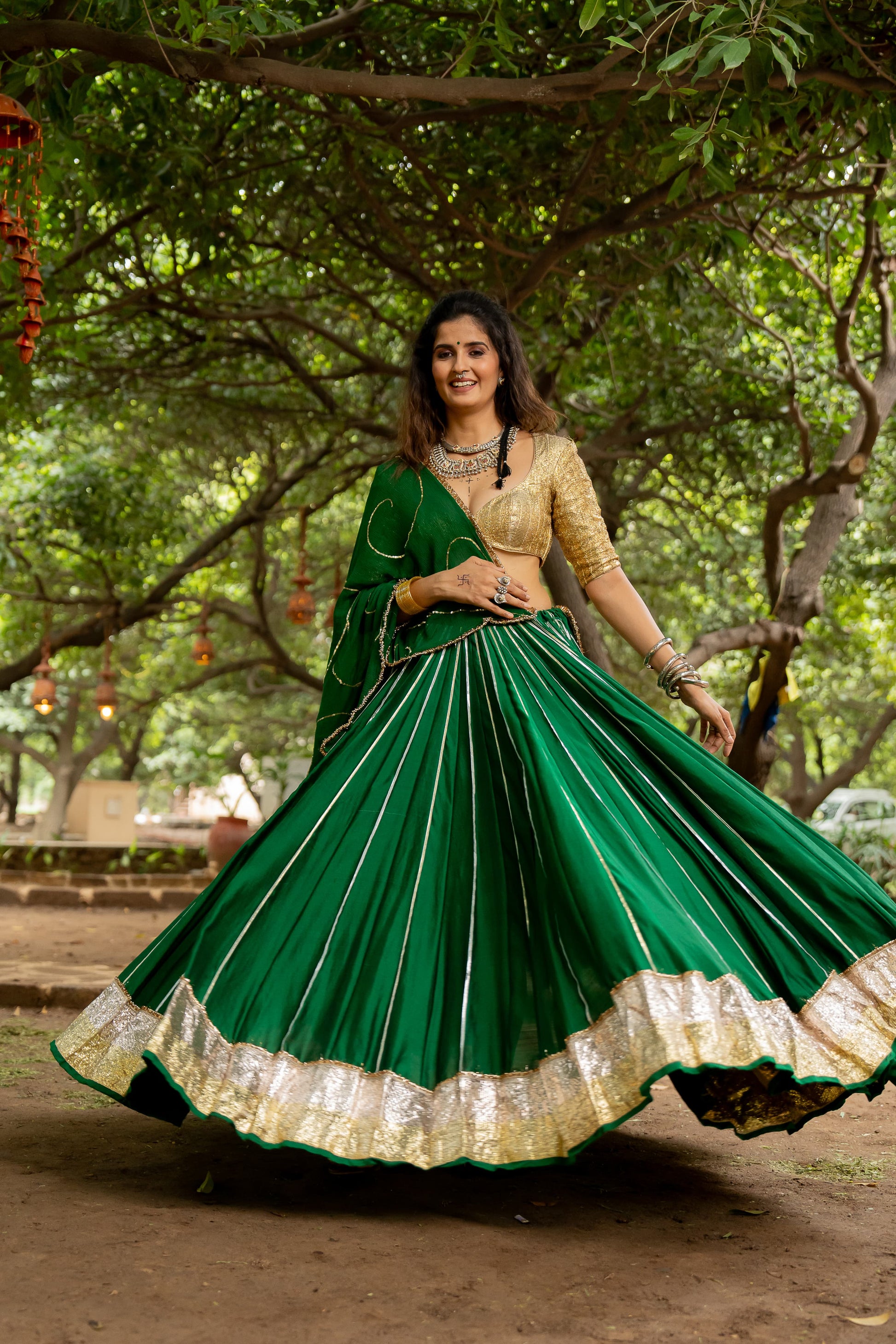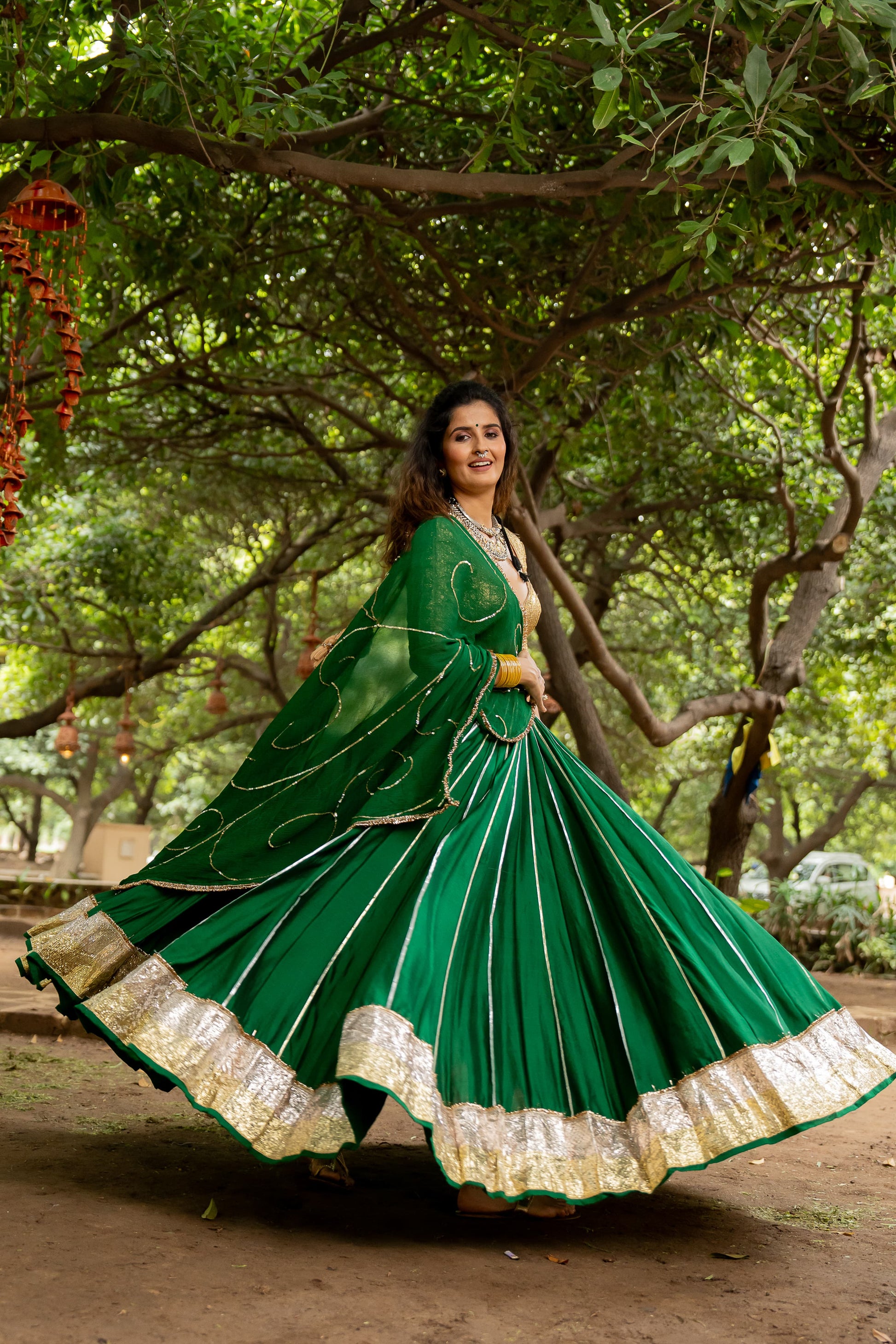 It is a Green spun silk skirt with toi all over with 6-inch lumpi and kiran lace all the hem of skirt.
