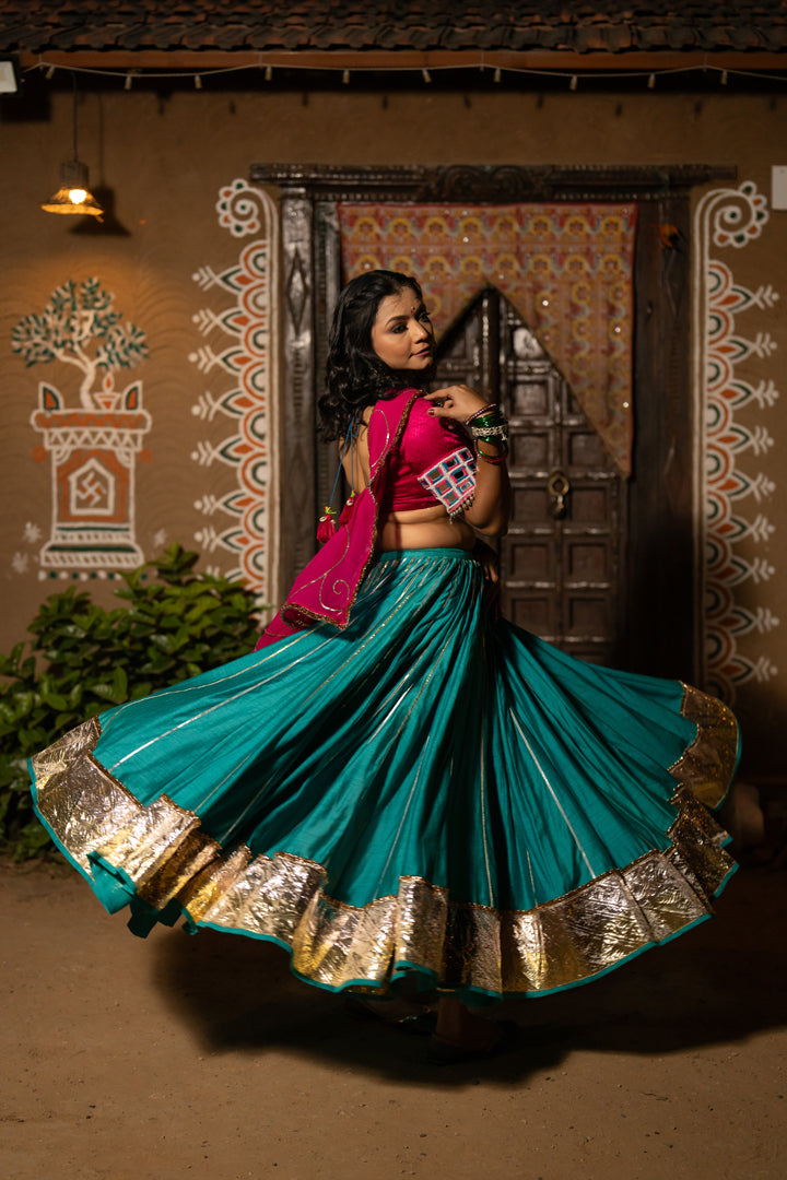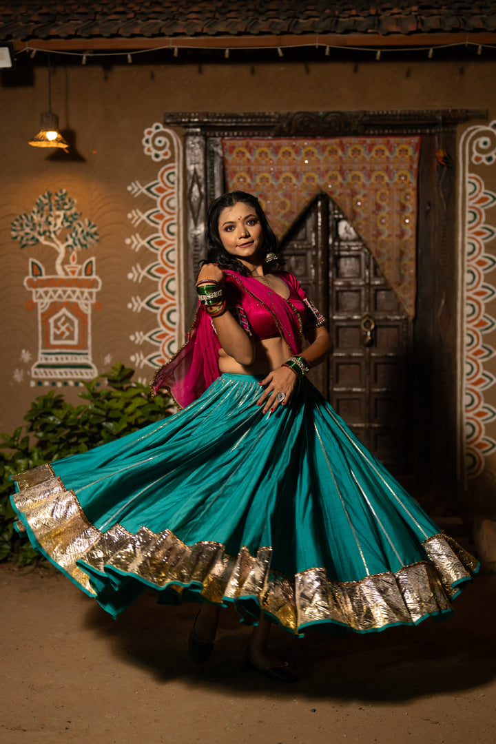 It is a Turquoise spun silk skirt with toi all over with 6-inch lumpi and kiran lace all the hem of skirt.