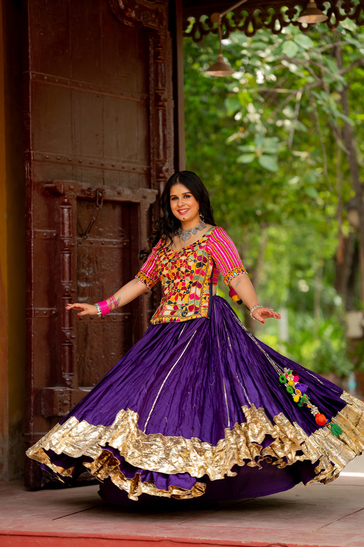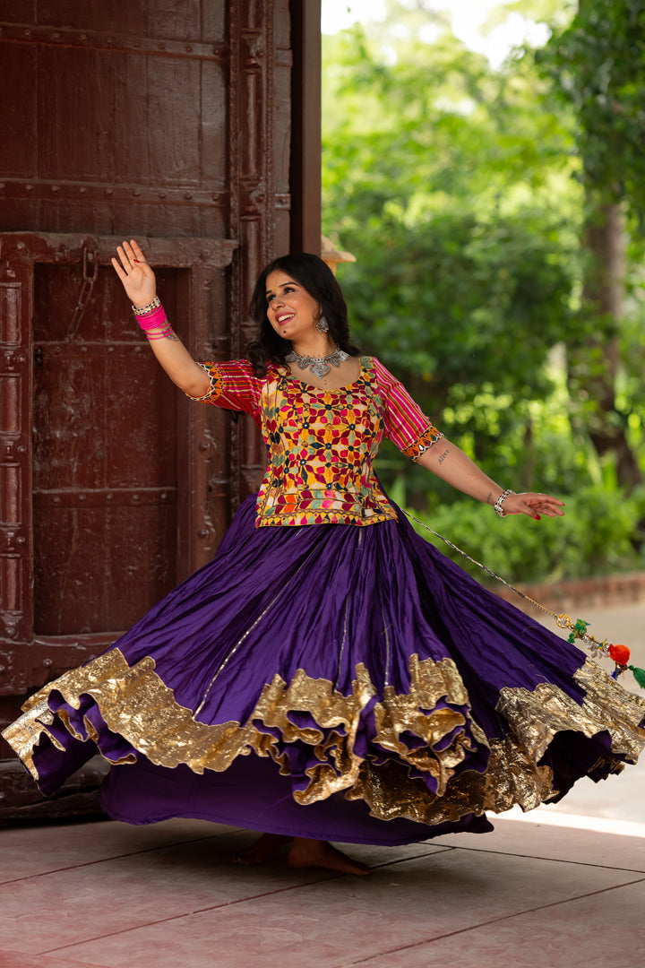 It is a Purple spun silk skirt with toi all over with 6-inch lumpi and kiran lace all the hem of skirt.