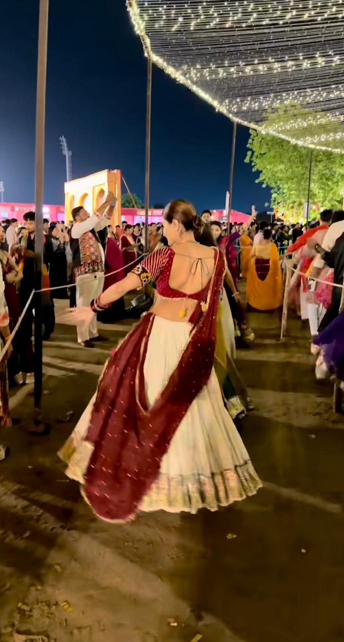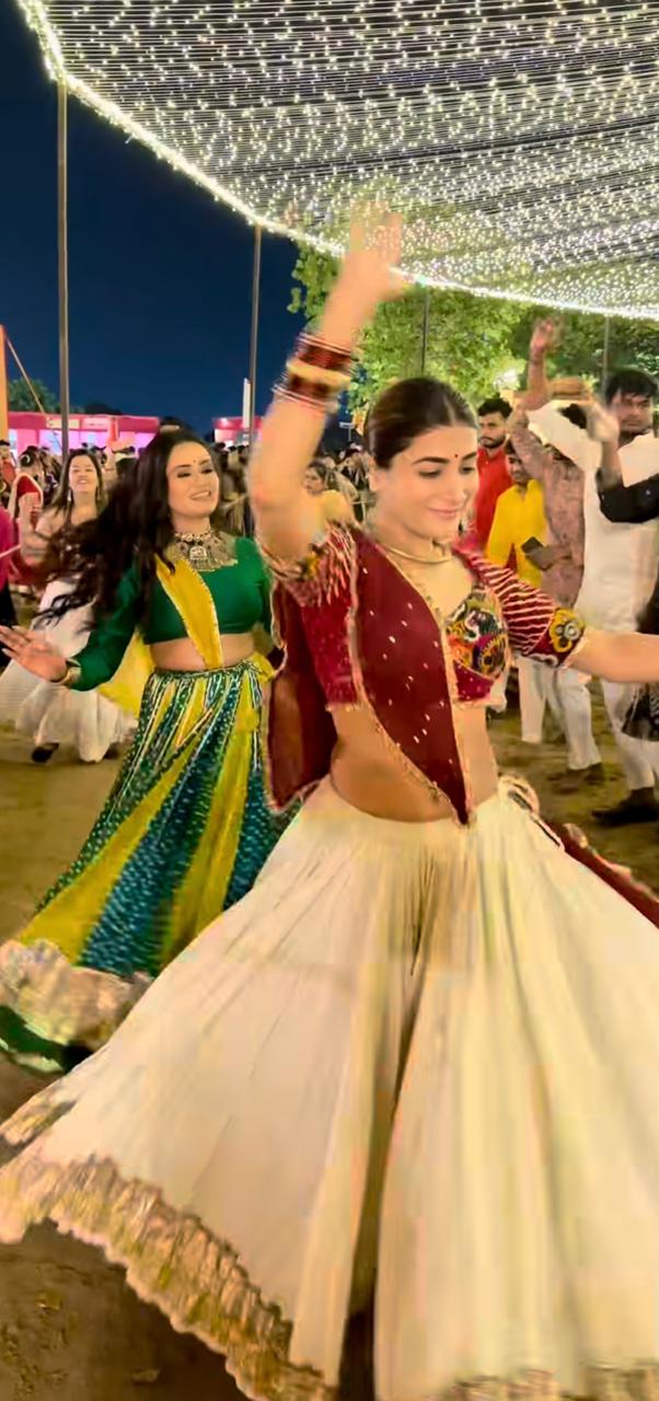 This Set features a white skirt with 6-inch Lumpi and Kiran lace, creating a 7-meter flare paired with a Kutchi patchwork blouse.