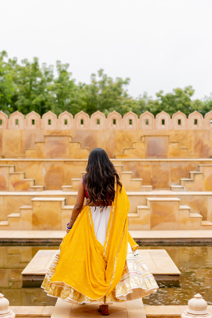 This Set features a Leheriya toi lumpi gradation gamthi skirt creating a 10-meter flare paired with a Full patch blouse featuring kodi trims and a chiffon dupatta with tiki work and Kiran lace.